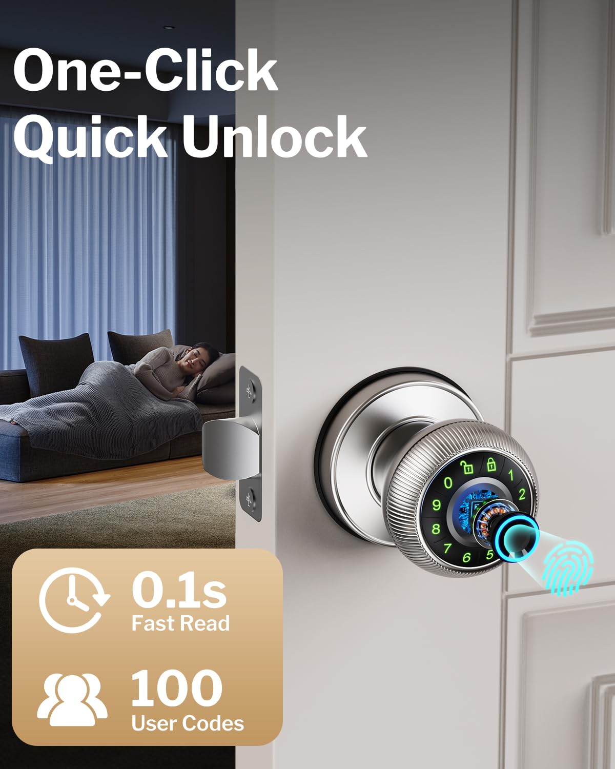Q: How does the fingerprint recognition feature work?A: The high-precision fingerprint sensor allows for quick recognition in just 0.1 seconds, enabling a swift and keyless entry experience. You can register up to 100 fingerprints, making it suitable for multiple users.