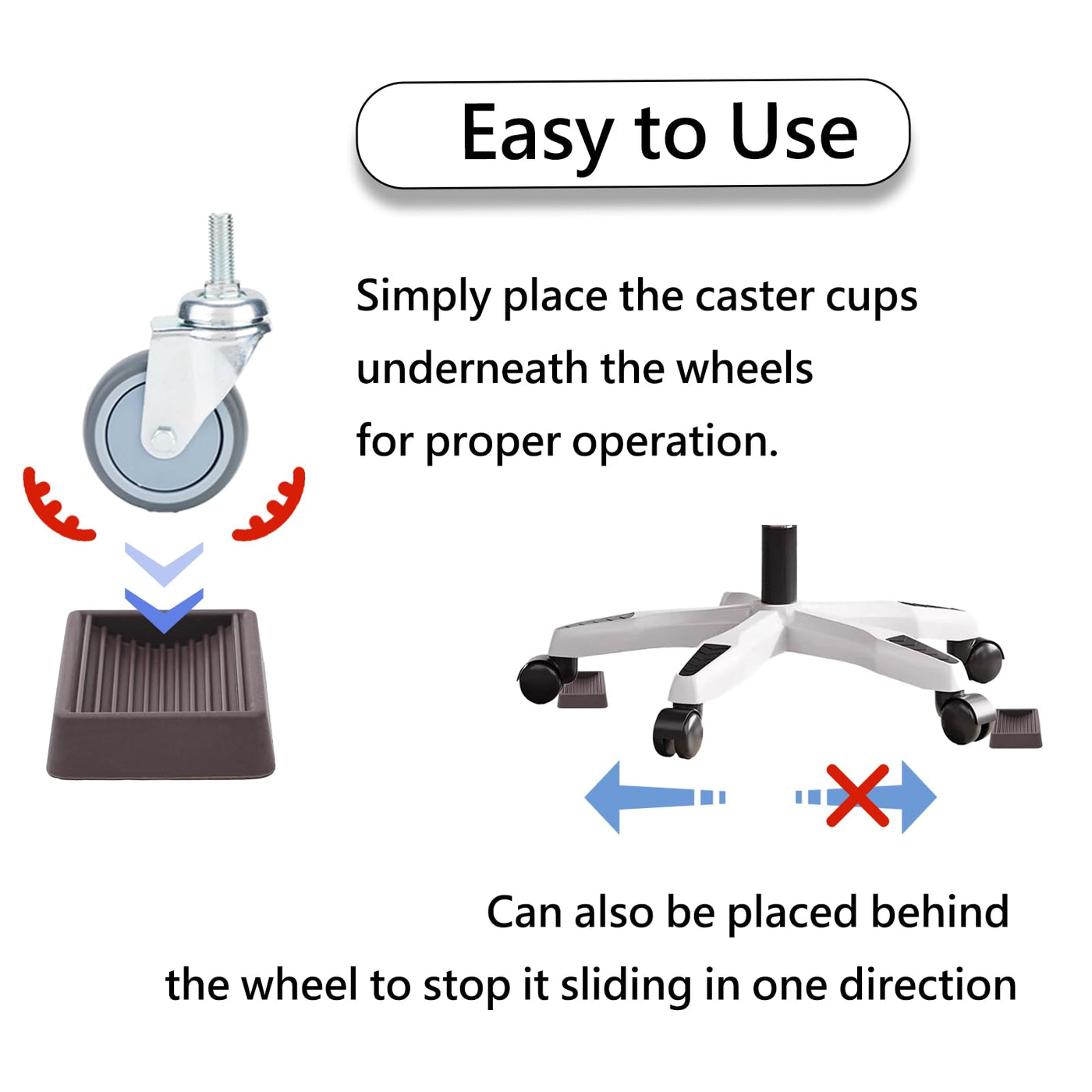 Q: How do I install the furniture caster cups?A: Installation is simple: just place the furniture caster cups under the wheels of your furniture. For added effectiveness, you can position them directly behind the wheels to prevent sliding, or place the casters inside the stopper.