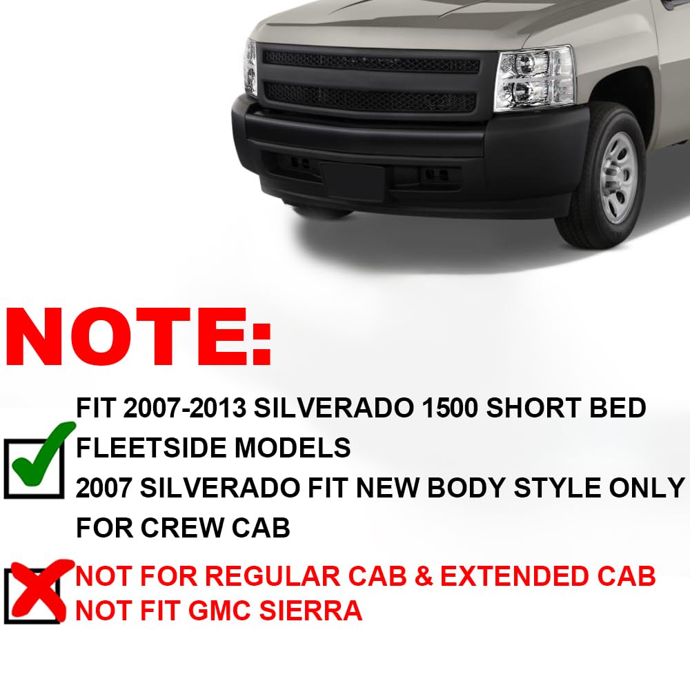 Title: Fender Flares Application: Compatible with Chevy Silverado 1500 LT / LTZ / WT / LS / Hybrid / XFE With 69.3 Bed Fleetside Models 2007-2013 2007 Compatible with Silverado Fit New Body Style Only Do not fit long bed models ONLY FIT 5.8' SHORT BED Color: Black Specifics and Benefits: Brand new in original box, never been tried on & used Exactly same as picture Comes with 1 set of 4 pieces fender flare (2 for front and 2 for rear) Made of high quality durable polypropylene with rough rugged textured surface Hardware for installation are included To protect wheel from mud, scratches, sand and other outer damage Gives your vehicle upgrade, refresh look No cutting or trimming needed; some drilling may be required Professional installation is highly recommended Package Includes: A set(4pcs) of Factory style Fender Flares Necessary mounting hardware