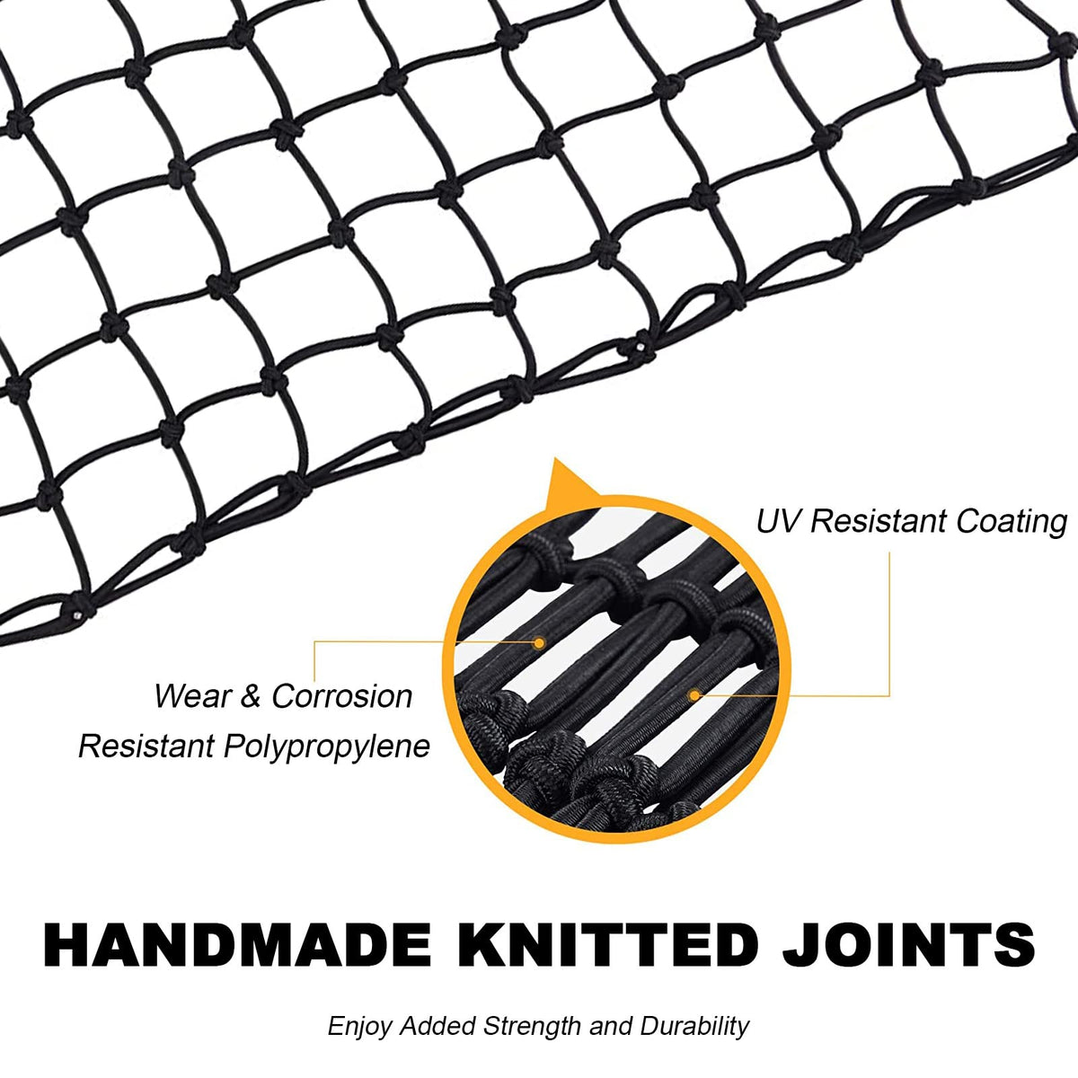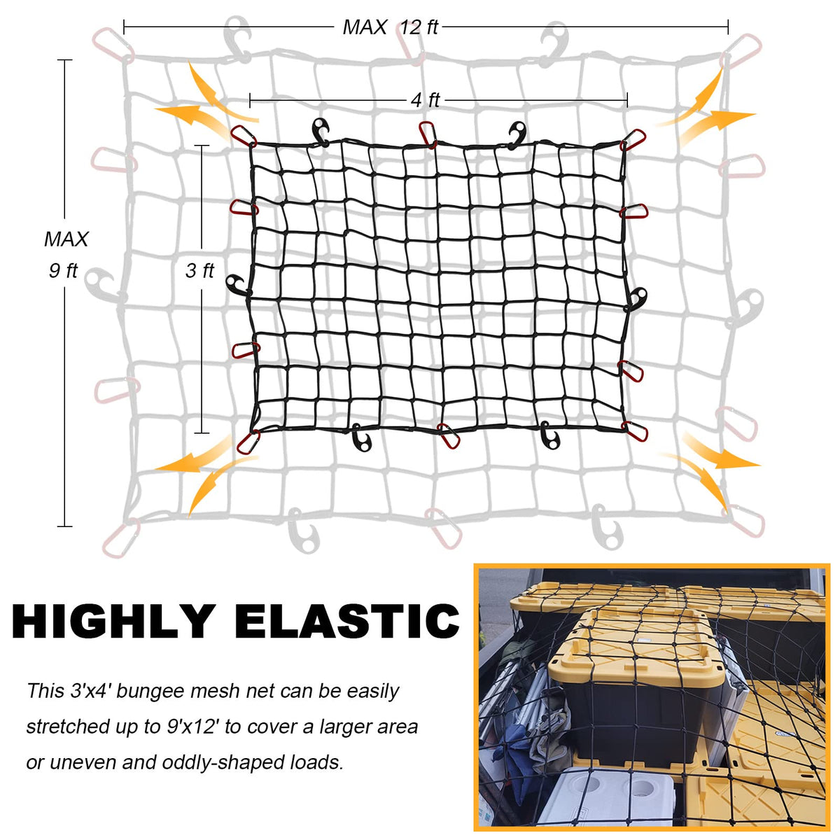 GSPSCN Cargo Net is made of nylon material with a latex band, which is more durable and firmer than others. Stretchable with great elasticity that can hold larger and bulkier objects inside. Specification Size: 3' 4' stretched to 9' 12' / Mesh Size:4 x 4 / Packing: 26 10 16 cm Weight: About 850g with bag / Rope diameter: 5mm latex / Hook: 12 (12 aluminum; 12 ABS) Perfect for Life's Adventures Carriage, Moving, Camping, Boating, Roundtrip, Hunting, Float Storage.