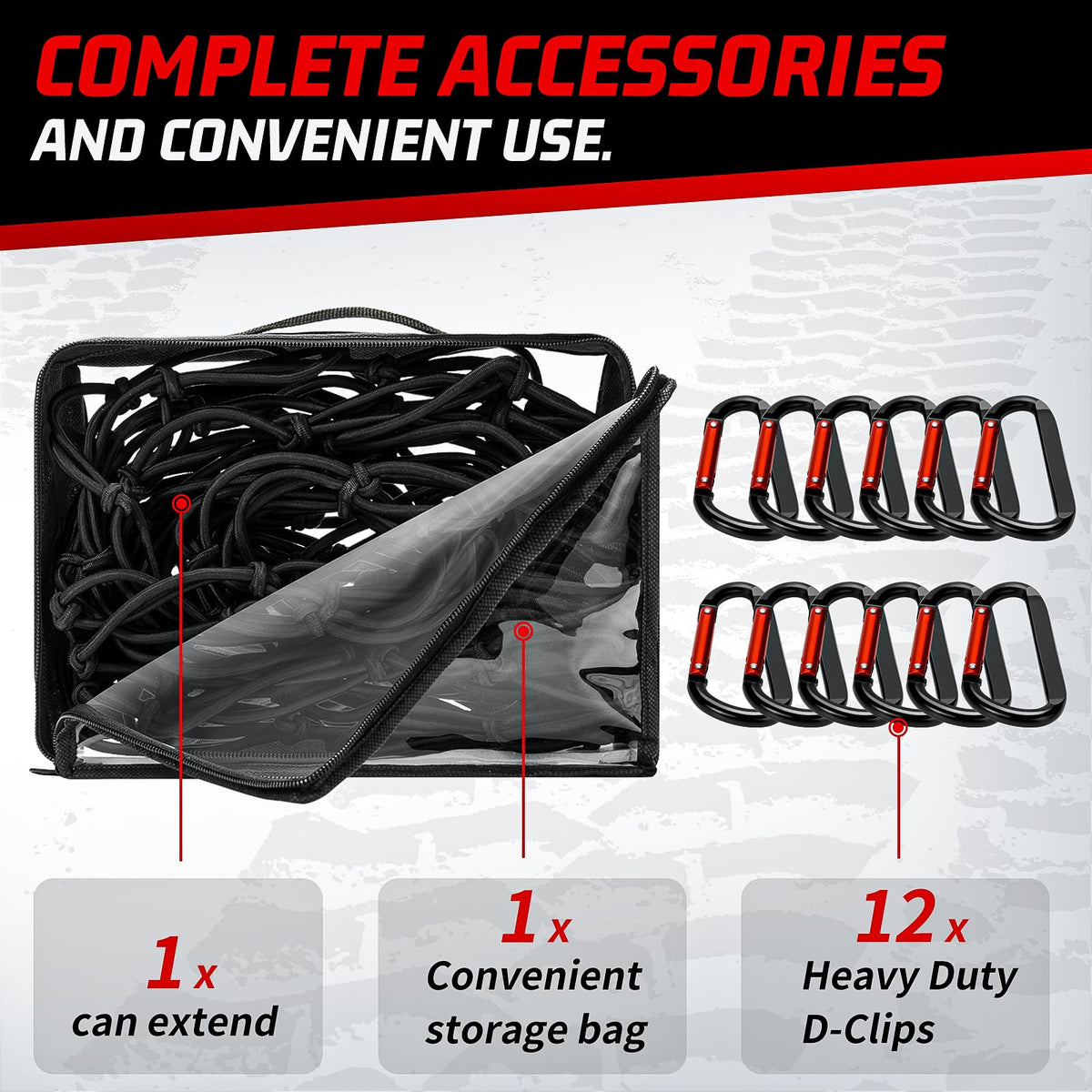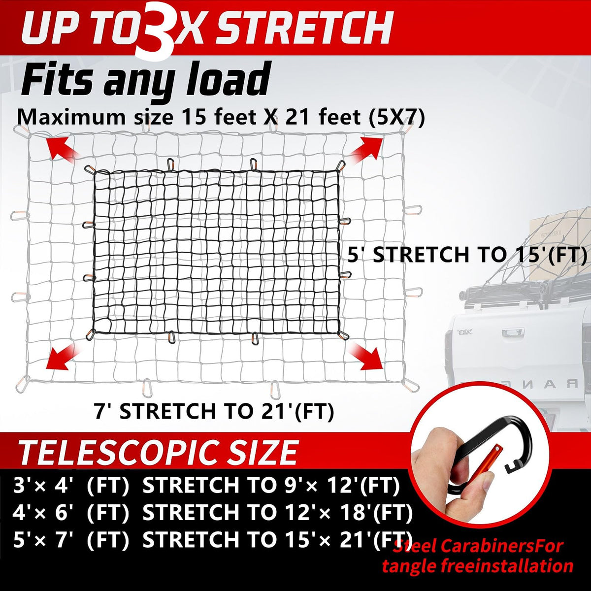 Heavy Duty Cargo Net For Pickup Truck Bed - Stretches From 5' X 7' To 15' X 21' - 12 Metal Carabiners - Compatible With Ford, Dodge Ram, Chevy, Toyota - Ideal For (Black, 5X7 Feet)