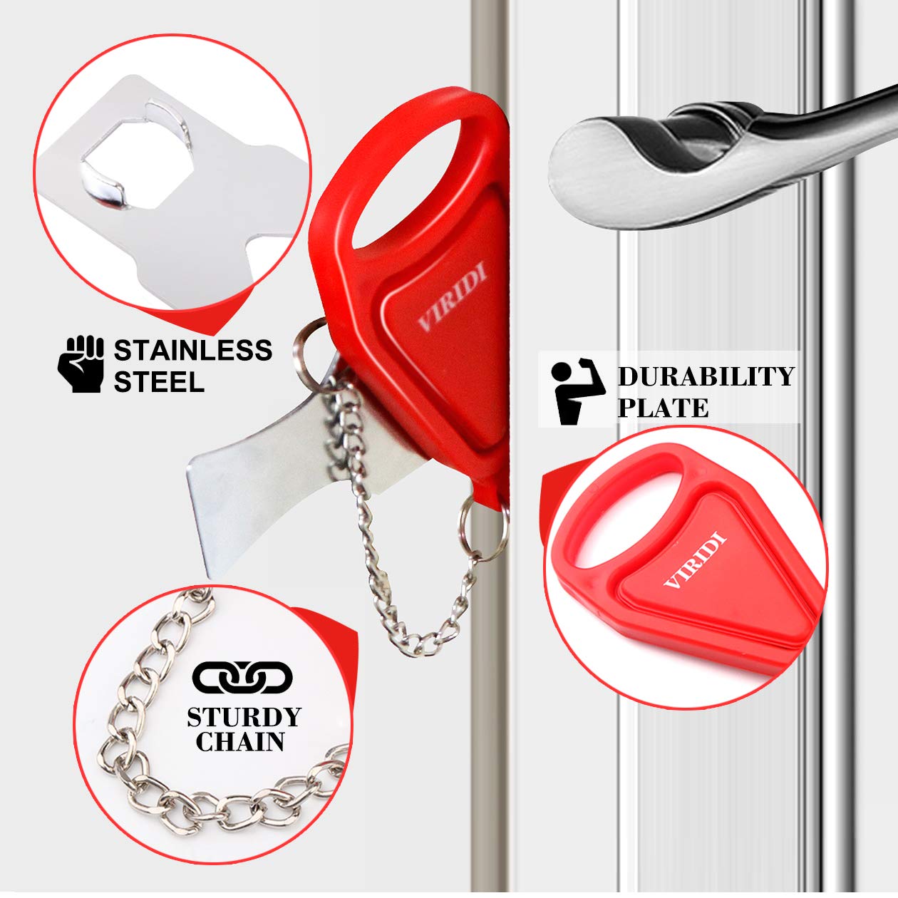 Q: What materials is the VIRIDI Portable Door Lock made from?A: This portable door lock features a robust construction with stainless steel and molded plastic, ensuring durability and resistance to rust and corrosion. Its compact design does not compromise its strength, making it a reliable security tool.