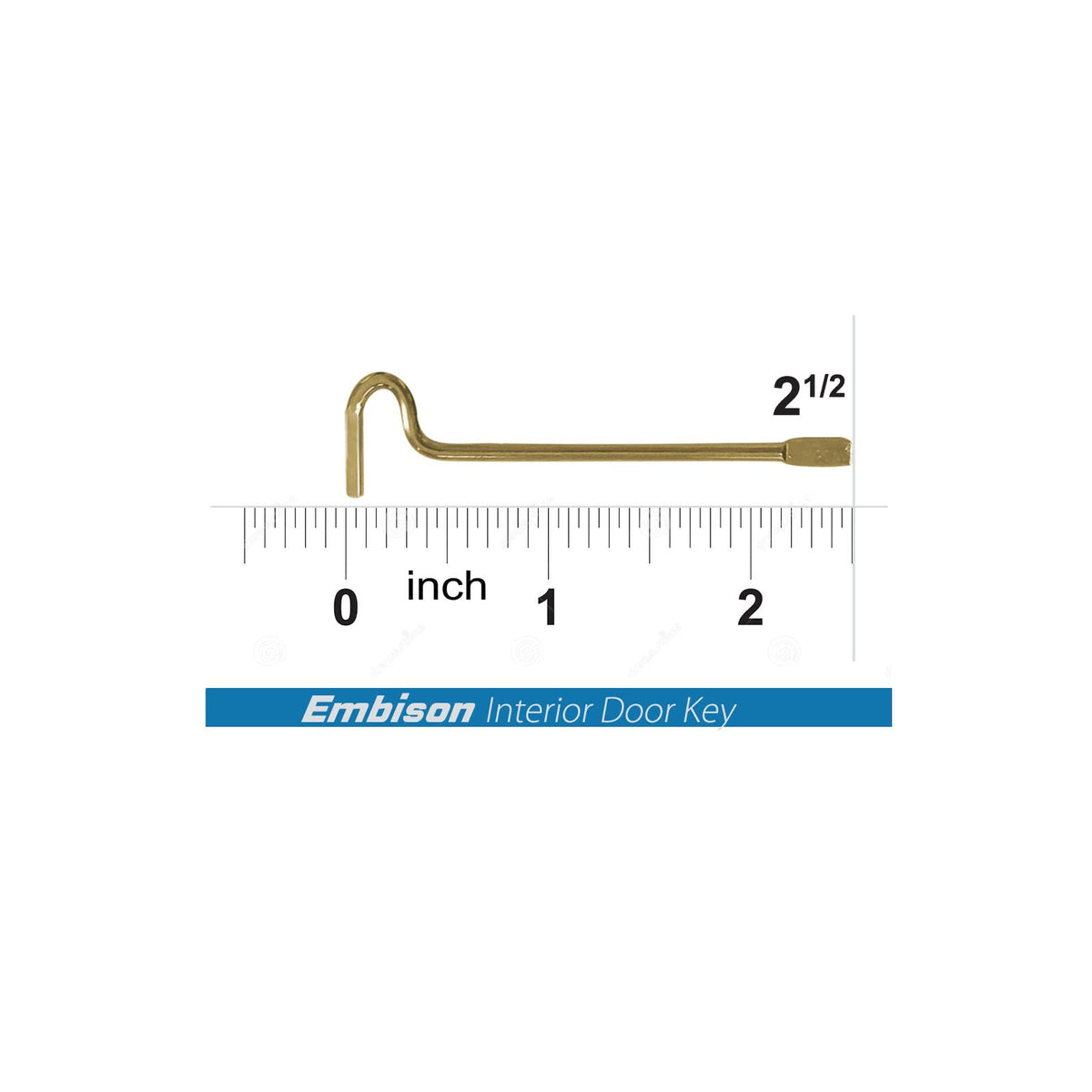 Q: What is the length of the Interior Bathroom Door Key?A: The Interior Bathroom Door Key measures 2-1/2 inches in length, making it a convenient size for emergency access.