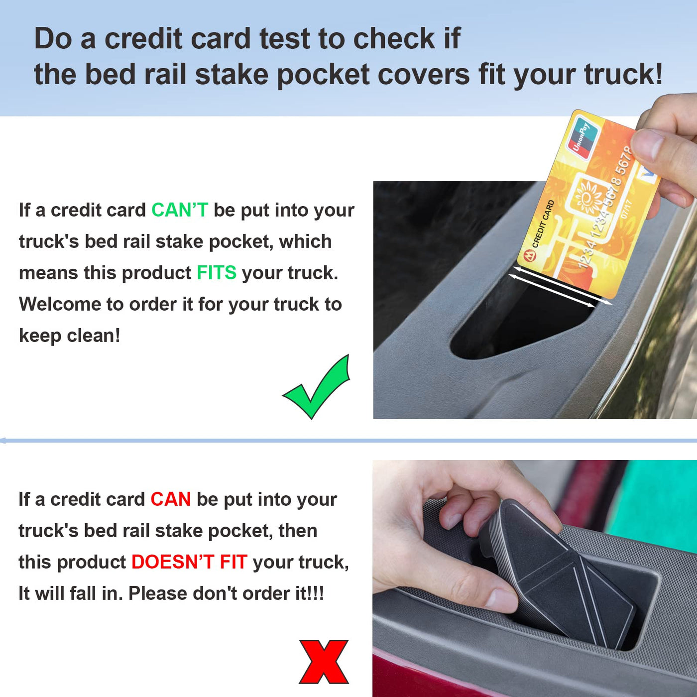 Q: How can I ensure the JKCOVER Stake Pocket Covers fit my truck?A: To check compatibility, perform the quick card test: if a credit card cannot be inserted vertically into the stake pocket holes, the JKCOVER Stake Pocket Covers will fit your truck. If it can be inserted, the covers will not fit.