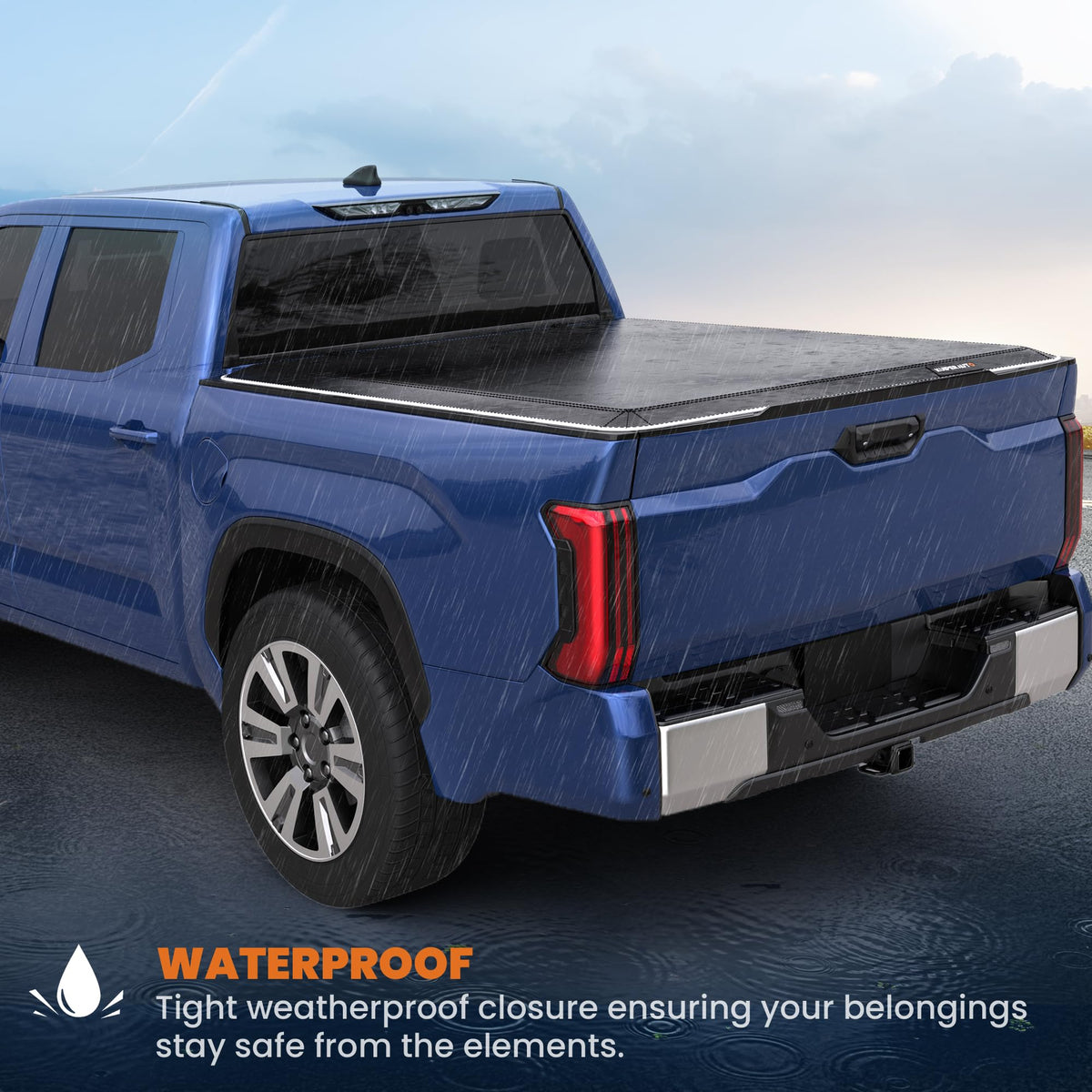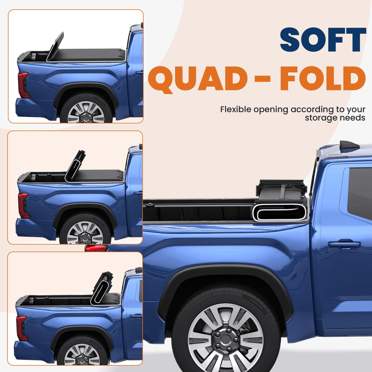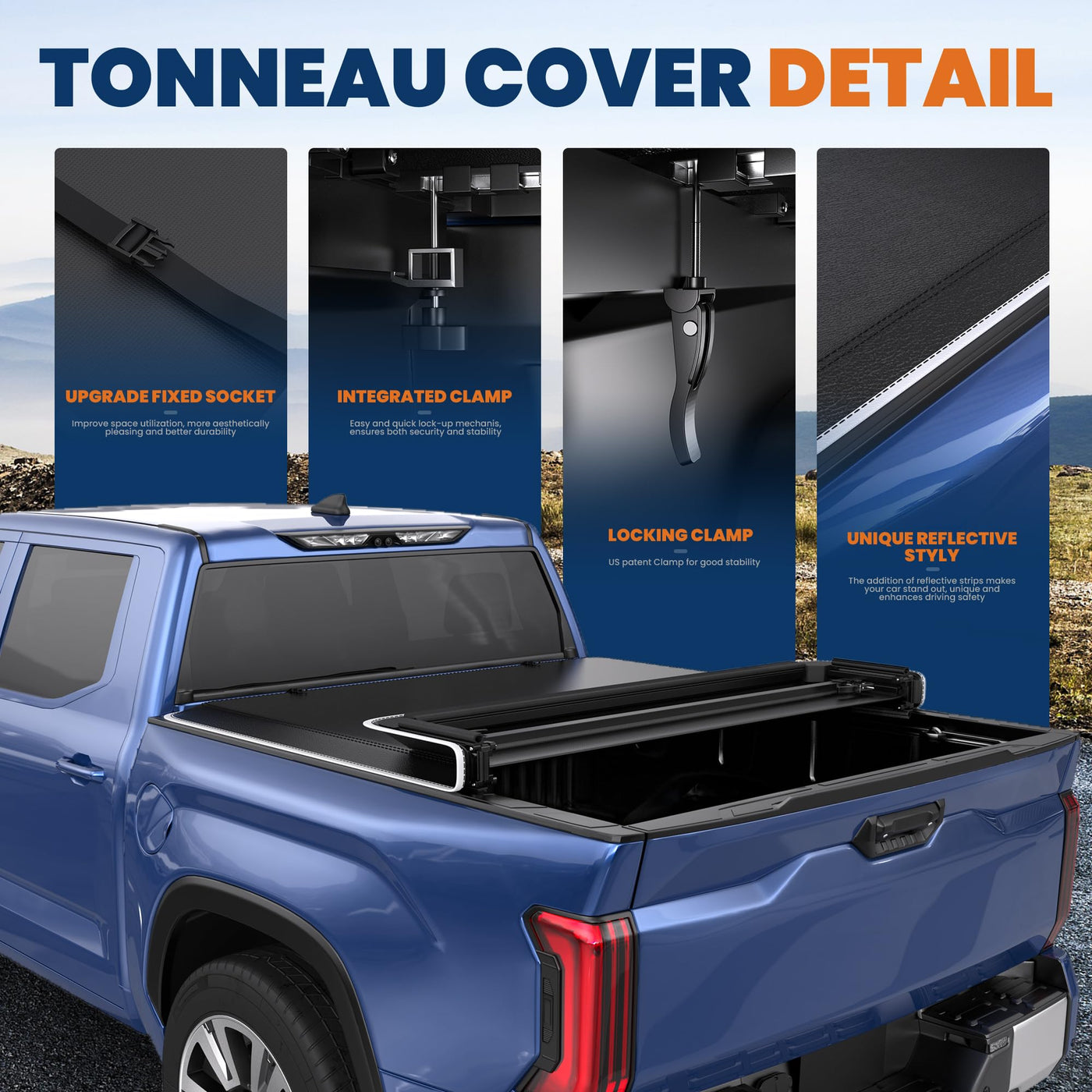 ?VEHICLE FITMENT?: Compatible for 2014 2015 2016 2017 2018 2019 2020 2021 2022 2023 2024 2025 Toyota Tundra 5.5ft Bed (incl Utility track system ) | ?Upgrated Reflective Strip & Quad-Fold?:Unique reflective strips can better guide the line of sight of drivers behind, enhancing visibility and safety on the road especially in low-light conditions.Compared to a tri-fold tonneau cover,a quad-fold one provides a larger storage space when folded up, making it convenient for storing bulky. | ?Protection from the Elements?: Constructed from water and UV-resistant materials, and featuring a weather strip that effectively repels water, keeping your cargo clean during inclement weather.Not only will this keep your car looking newer for longer, but it can also prevent costly damage to the paintwork. | ?Easy to Install?:Installation is simple and effortless,no drilling or further modification are needed.Simply pull it over the truck roof and secure it in place with the provided fasteners.(Pls be aware that some truck models with bedliner may need to drill holes to add latch holders) | ?Pre-Purchase Information?: Pls make sure that both of your car model and bed size are compatible for our tonneau cover. Measure the opening on the roof of your car or truck before ordering and confirm that matches, thanks for your understanding.