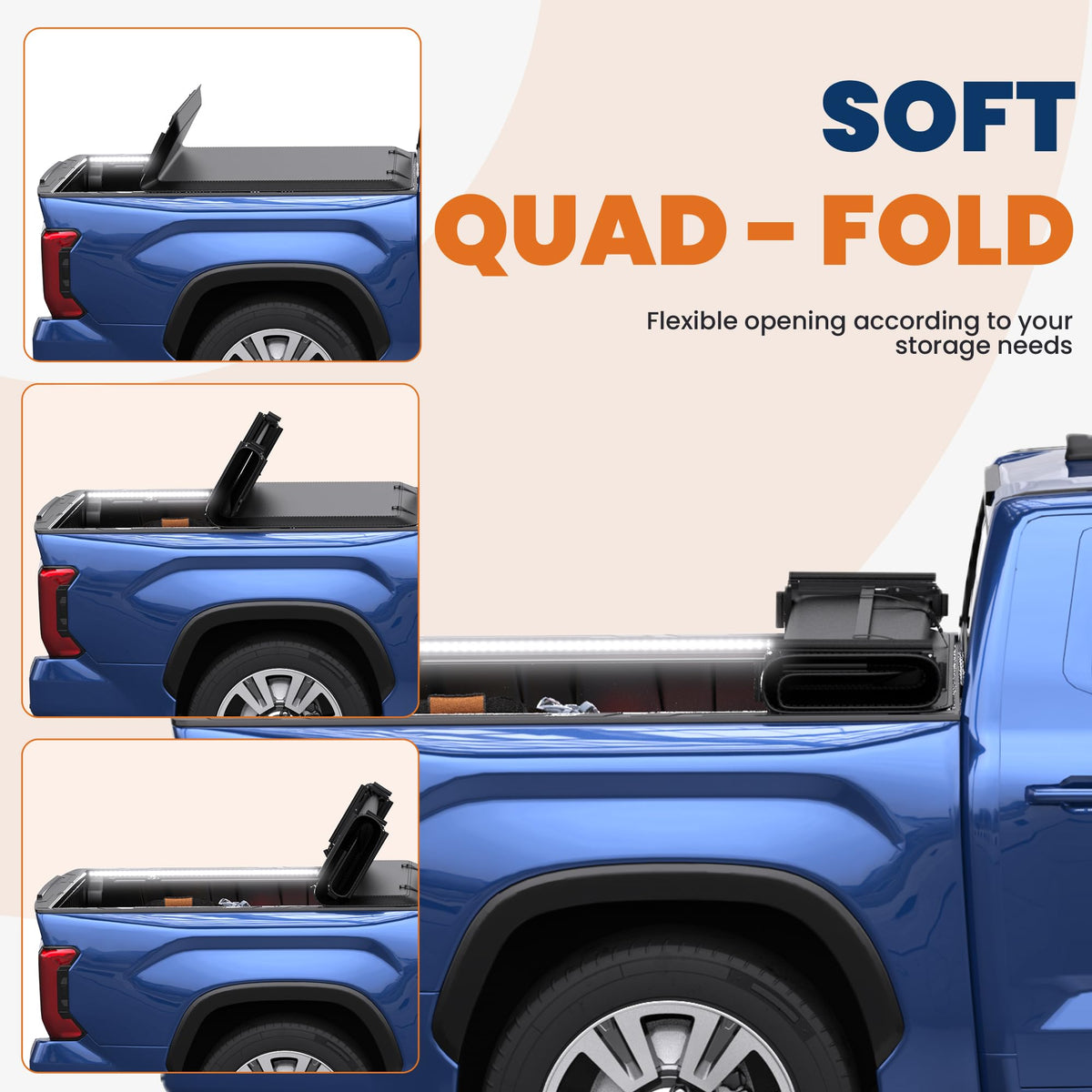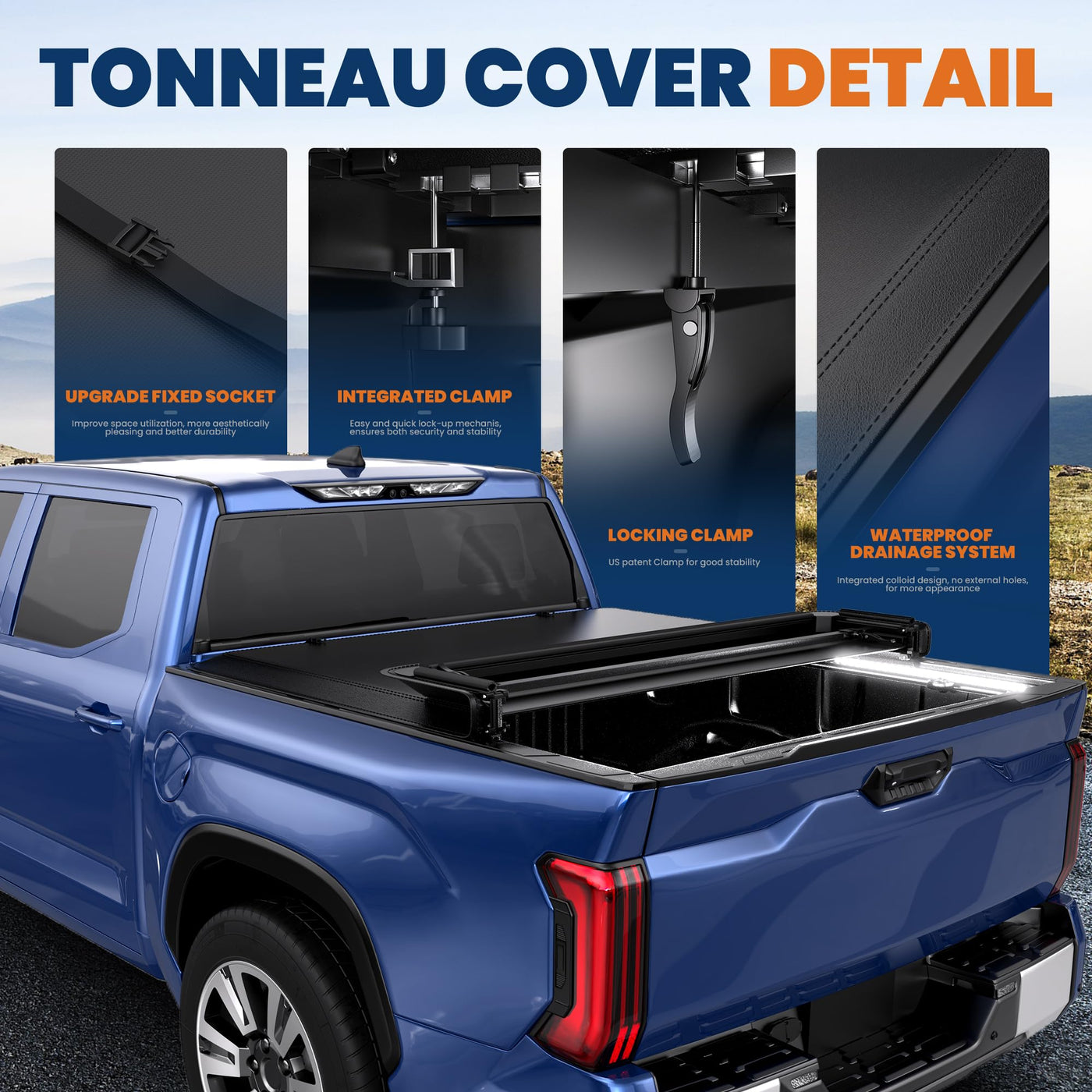 [Fitment] Compatible for 2014-2021 Toyota Tundra 6.5ft Bed (incl Utility track system ) | [ Easy to install ]: Installation is simple and effortless which can be quickly completed within 15-20 minutes. Pull it over the truck roof and secure it in place with the provided fasteners. Included manual guides you through the installation process. No additional modifications is required.(Led Light is included). | [ Upgrated Quad-Fold Cover ]: Compared to a tri-fold tonneau cover, a quad-fold tonneau cover provides a larger storage space when folded up, loading groceries or other bulky cargo onto the vehicle would be much easier. And also takes up less storage space when not in use. | [ Protection from the Elements ]: The patented clamp design ensures a perfect fit, while the high quality water and UV-resistant vinyl panel with a weather strip repels water, keeping your cargo clean in bad weather. This helps maintain the appearance of your car and prevents expensive damage to the paintwork. | [ Pre-Purchase Information]: Pls measure the opening on the roof of your car or truck before ordering and confirm that matches, and also check fitment car model before placing order.Some truck models with bedliner may need to drill holes to add latch holders.Thanks for your understanding.