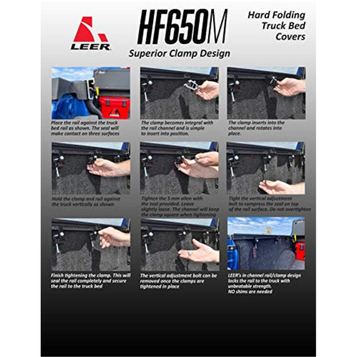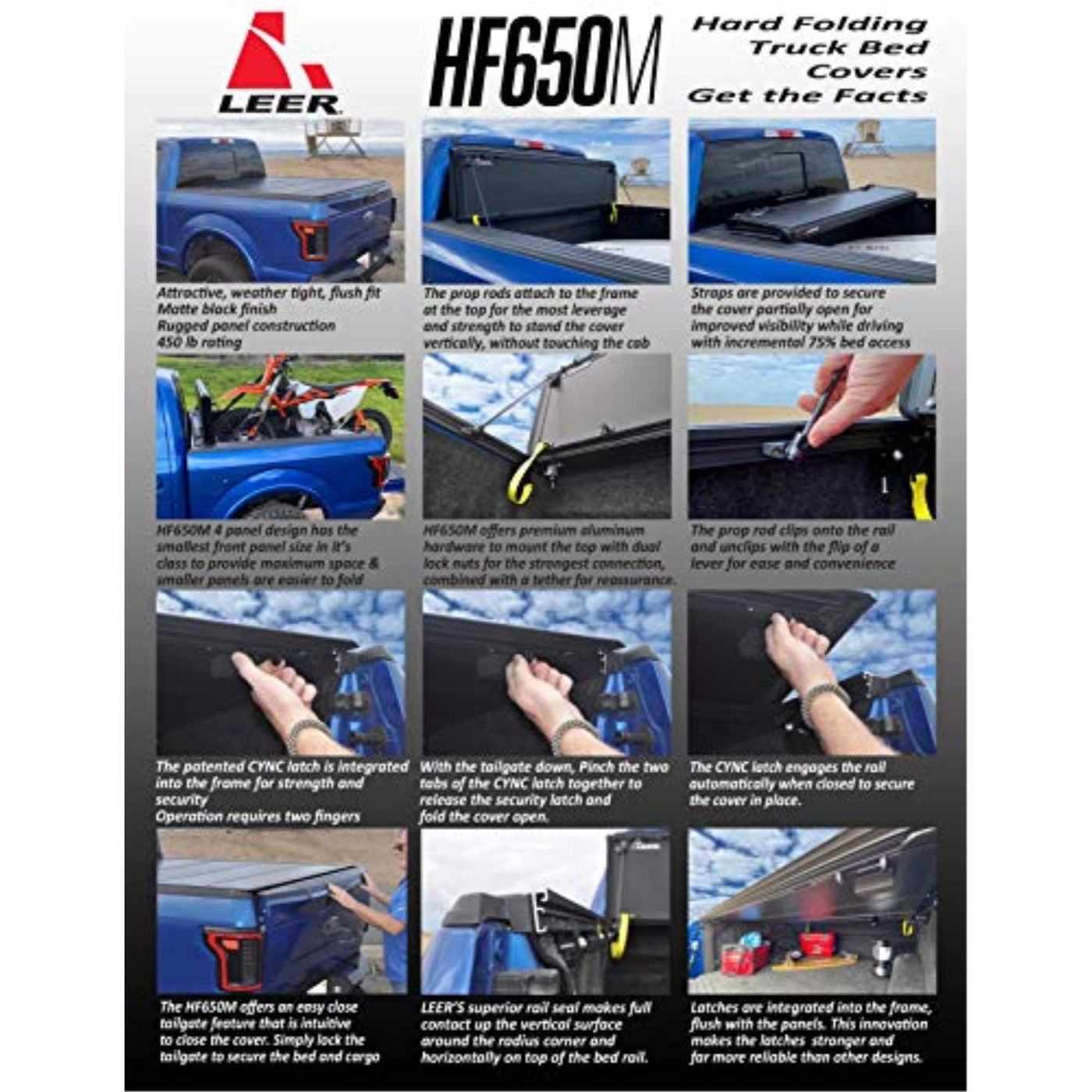 FITS PERFECT/EASY TO LATCH – LEER’s industry exclusive CYNC latching system allows easily opening the cover with two fingers from either side of the truck bed. Latches with open or closed tailgate. | SLEEK LOOK – The patented HF650M Hard Folding Cover has a sleek, 12MM low-profile design with thinner rails, allowing for a true flush mount and more cargo space inside the bed. | FOUR LIGHTWEIGHT PANELS - The HF650M offers ultimate flexibility with four lightweight, durable, dent-resistant panels made of fiberglass reinforced plastic polymer. When opened, the quad-fold design keeps the third brake light and window visible and protects the back of your cab and window by locking into position away from the cab. 450 lbs. evenly distrusted load rating. | NO-DRILL INSTALLATION – With an easy and fast installation process, the HF650M comes with the tools and instructions to install your tonneau. This allows you the ability to easily take your cover off or put it back on.