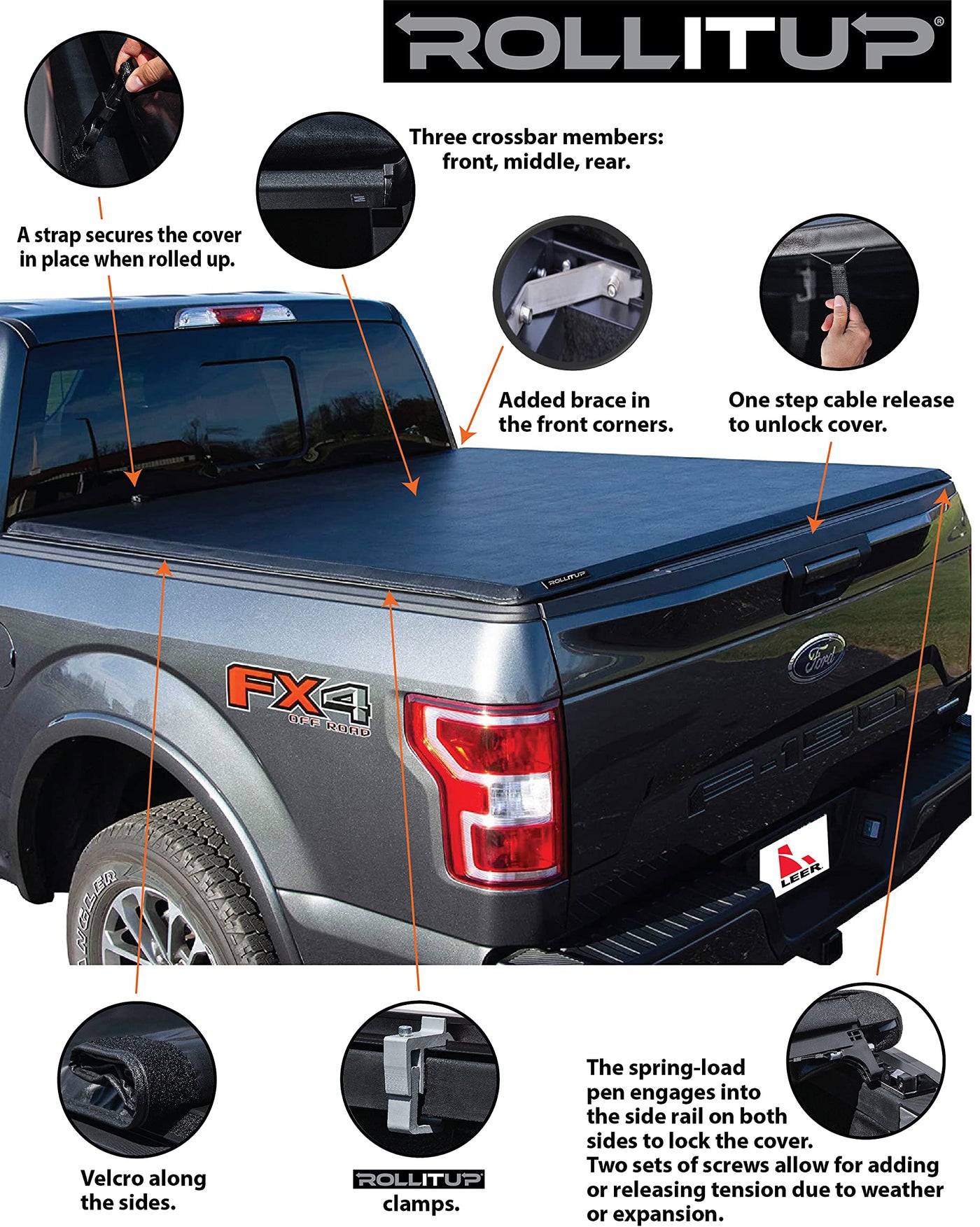 FITS PERFECT/EASY TO LATCH - ROLLITUP tonneau covers fit perfectly on your bed rails and each part number is specifically designed for your model truck! Our ROLLITUP has an easy to latch mechanism that closes and locks at the end of the tailgate. Each cover has an adjustable tension system, keeping your ROLLITUP tight and wrinkle-free in any weather condition. | BUILT TO LAST - Our cover is made out of heavy-duty 24-ounce tear-resistant, marine-grade vinyl, with 3 built-in crossbars that offer support when the cover is lying flat. Our side rails and clamps are made of 6063 aluminum, which is corrosion-resistant. | 100 PERCENT BED ACCESS - When you