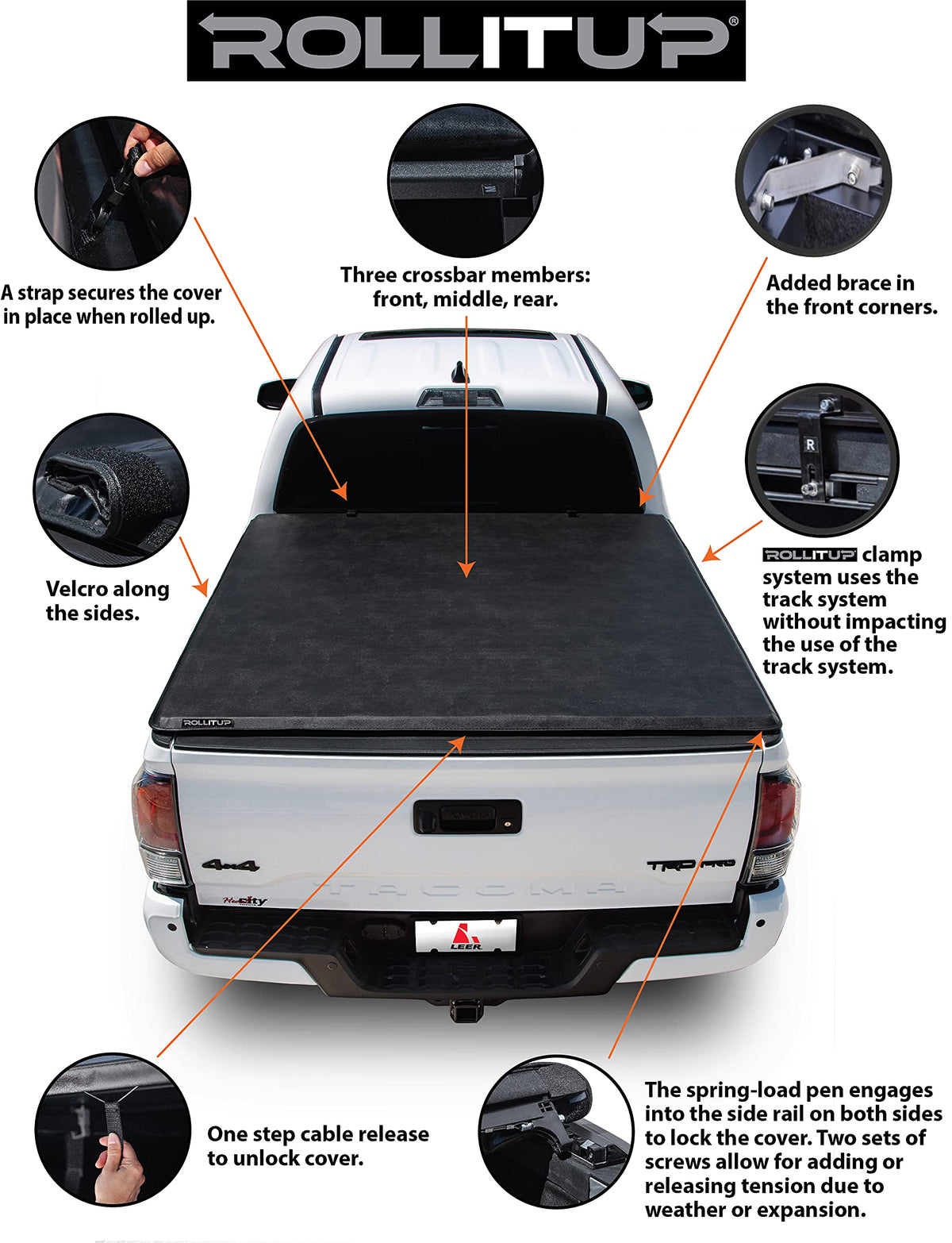 FITS PERFECT/EASY TO LATCH - ROLLITUP tonneau covers fit perfectly on your bed rails and each part number is specifically designed for your model truck! Our ROLLITUP has an easy to latch mechanism that closes and locks at the end of the tailgate. Each cover has an adjustable tension system, keeping your ROLLITUP tight and wrinkle-free in any weather condition. | BUILT TO LAST - Our cover is made out of heavy-duty 24-ounce tear-resistant, marine-grade vinyl, with 3 built-in crossbars that offer support when the cover is lying flat. Our side rails and clamps are made of 6063 aluminum, which is corrosion-resistant. | 100 PERCENT BED ACCESS - When you