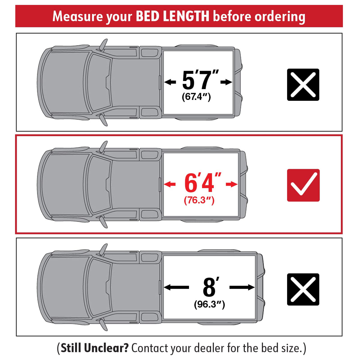 This soft roll up truck bed tonneau cover is manufactured from top quality materials in the industry and designed for easy no-drill installation. Not only will the customized fitment of this bed cover allow your vehicle to look sleek and stylish but the roll up style will maximize your access to the bed space.FITMENTBed Size: 6'4'' (76'') BedCompatible with 2009-2018 Dodge Ram 1500Compatible with 2010-2024 Ram 2500 3500Compatible with 2019-2024 ClassicNot Compatible with models with RamBoxCab size does not matter as long as you have the correct model and bed size.