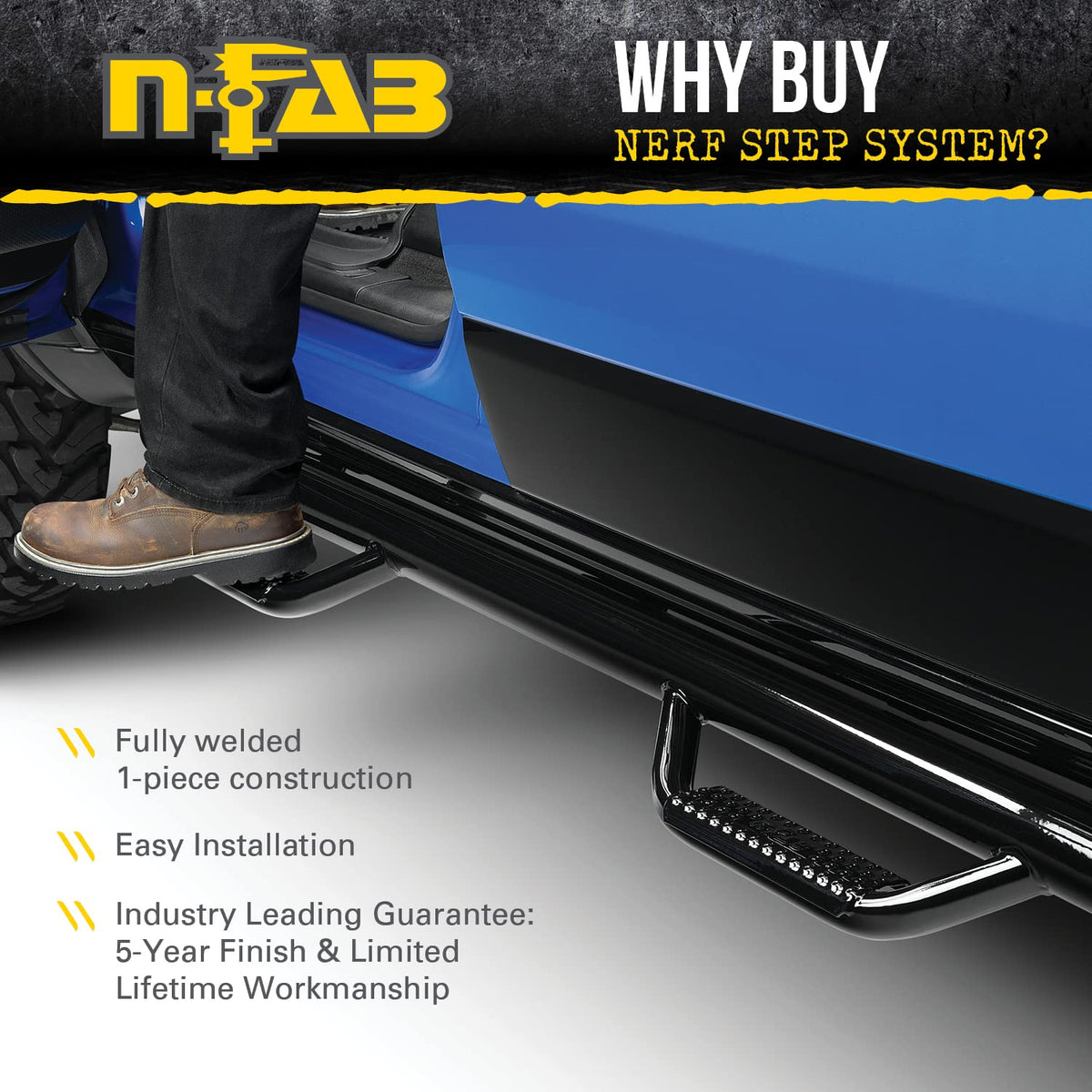 N-Fab Nerf Steps Feature A Clean Design That Fits High And Tight To The Vehicle Body In Either Premium Textured Black Or Gloss Black Finishes, Adding To The Modern Look Of Your Ride. Nerf Step'S Fully Welded 1-Piece Construction Offers Strength And Durability. With A Patented Drop Down Hoop Step At Each Door With Metal, Dimpled Step Plates, Nerf Steps Allow For Easy Access To Your Stock Or Lifted Vehicle And Deliver Reliable Traction And Stability In Any Weather Condition. Installation Is Easy. Includes All Mounting Hardware And Easy To Understand, Vehicle Specific Instructions. N-Fab Products Are Backed By An Industry Leading 5-Year Warranty On The Product'S Finish, And Limited Lifetime Warranty On Workmanship.