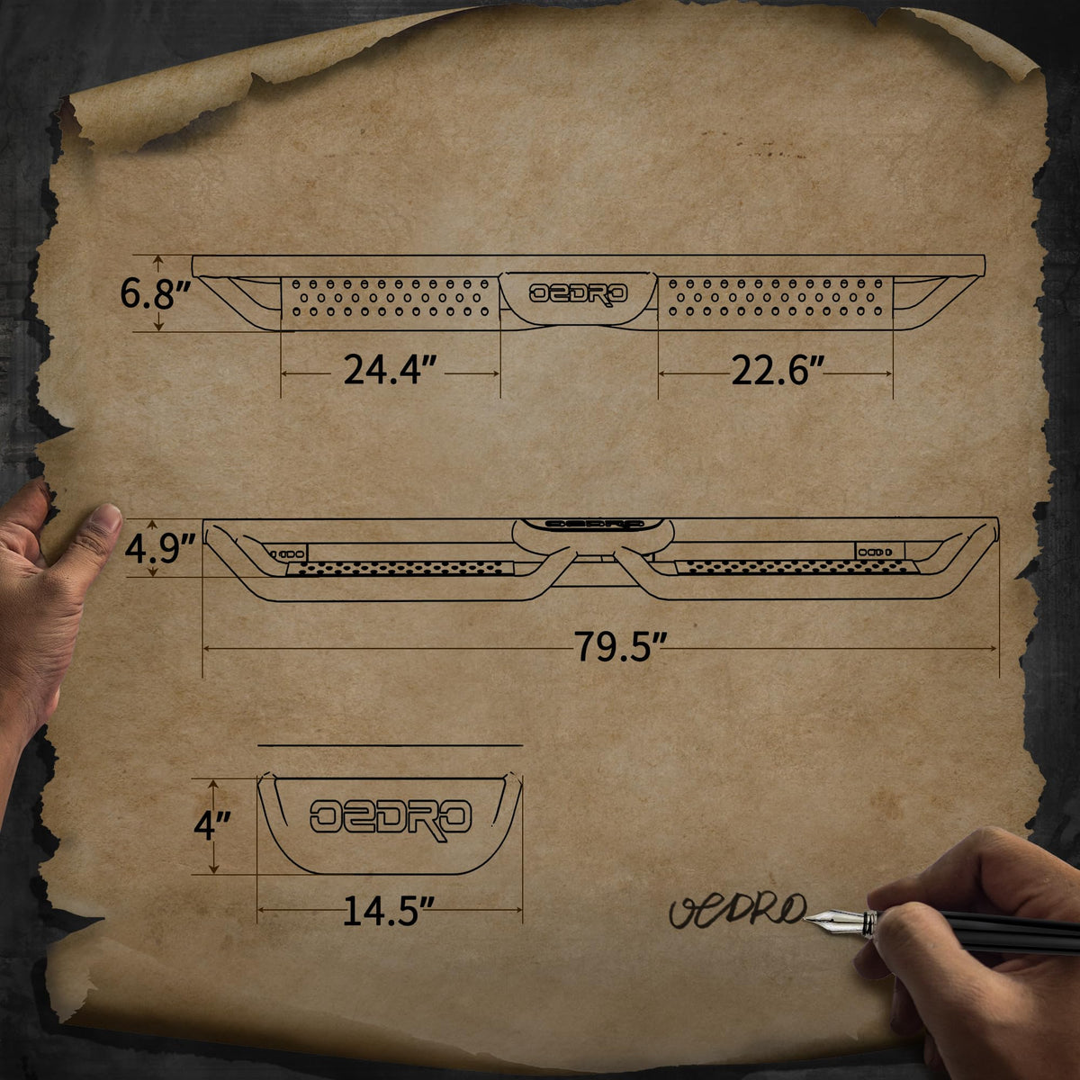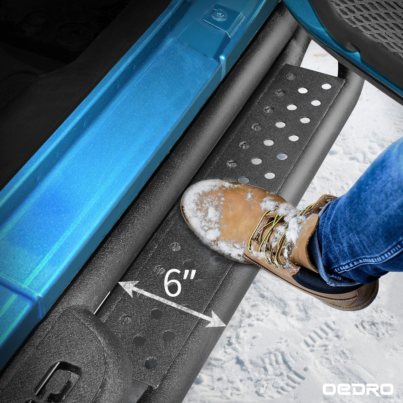 Custom Fit: Truck running boards offer tailored compatibility with 2024 2025 Tacoma Double/Crew Cab; Get ready for any journey with easy bolt-on installation | Wheel to Wheel Bed Access: OEDRO side steps feature a dual convex platform design; The 80.0in length is longer than usual, simplifying roof and bed cargo access without needing to climb into the truck bed | Functional Protection: ? 6inch tacoma side steps feature 4-steps design to provide better convenience for vehicles with lift kits and oversized wheel tires. Also allows for easier rooftop operation.? Three-tube design provides more protection for the bottom and the side of the car, also preventing from getting stuck on the rocker plate or hanging obstacles | Anti-Slip Surface: Our side steps feature a unique perforated surface with powder coating to prevent slipping and eliminate water, dust, and snow buildup, enhancing safety and durability | Robust Construction: Built to last, these nerf bars are crafted from strong steel for exceptional strength; Each side, with a spacious 6-inch wide surface, supports up to 550 pounds, ensuring sturdiness and deformation resistance