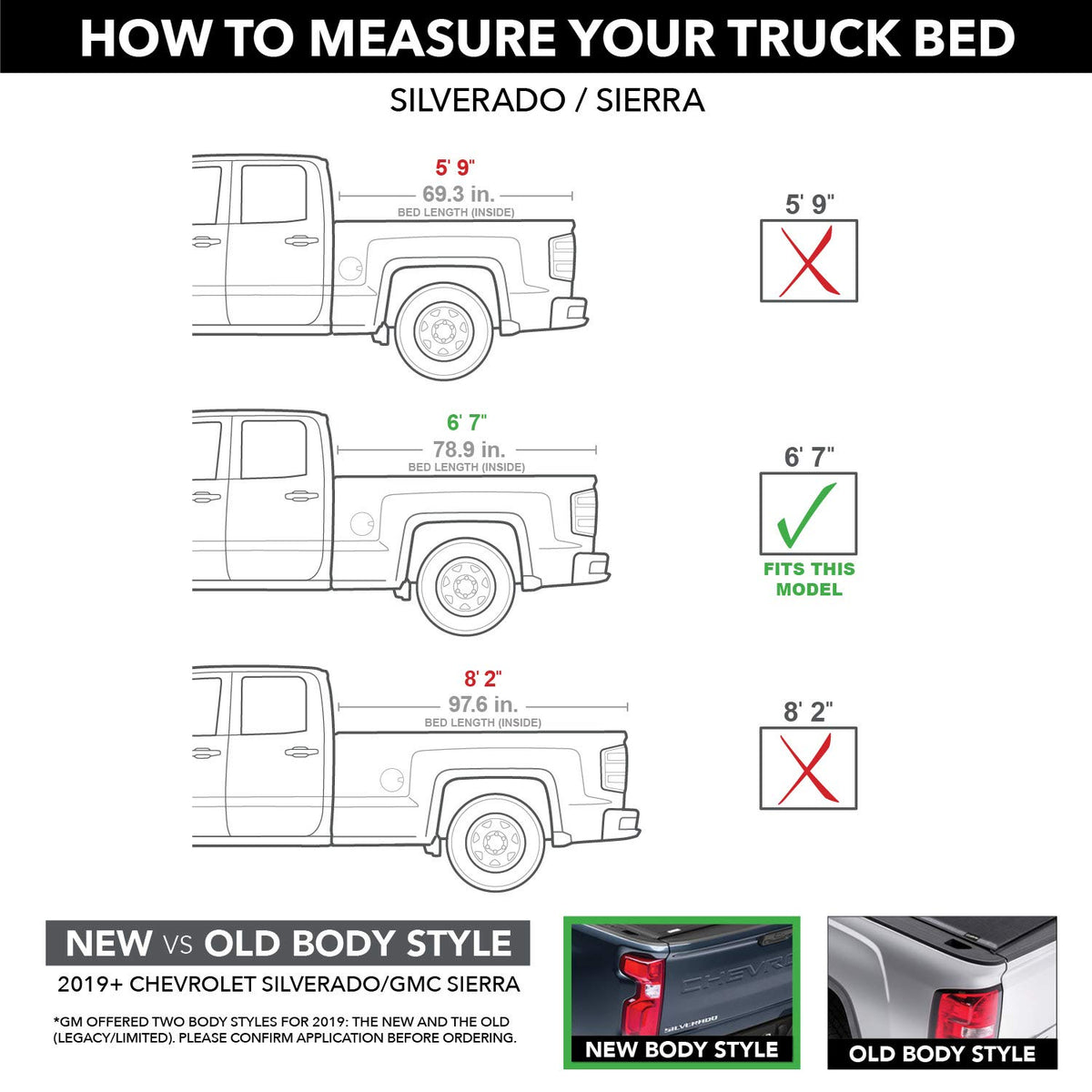 Q: What models of trucks are compatible with the BAK BAKFlip F1 tonneau cover?A: The BAK BAKFlip F1 tonneau cover fits 2014 - 2018, 2019 Limited/Legacy Chevy/GMC Silverado/Sierra models, specifically the 2014 1500 and 2015-2019 models with a 6' 7" bed (78.9 inches).