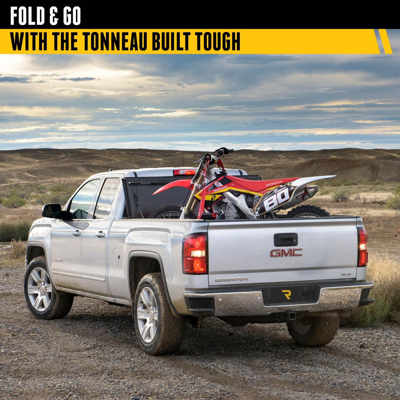 The BAKFlip F1 tonneau cover has two main positions: Folded upright, giving you total access to your truck bed with rear window protection, and folded down, leaving you with a truck bed cover that locks into place to protect your cargo from both the weather and sticky-fingered bandits. But perhaps the most stand-out quality of the BAKFlip F1 truck bed cover is its ability to not just withstand, but excel in extreme work and weather conditions. You can leave the denting, cracking, warping, fading, rusting and corrosion to lesser tonneau covers, because this thing boasts a polymer top, leak-proof rubber seals and EPDM rubber hinges that are made to outlast your truck. They certainly wont let you down the next time you need to haul cargo during a sudden downpour. The BAK team knows how to make quality products, and the BAKFlip F1 keeps up with its namesake with high-tech, bulletproof construction and a long list of design features. They started with a super-rigid EPS core and then sandwiched it between - or, rather, laminated it with - a fiberglass-reinforced polymer on top and an epoxy-coated aluminum on bottom. Ok, so it may not be ''bulletproof.'' But, no would-be thieves are getting through that deck any time soon. When you add in the fact that the top of the cover can handle a load rating of 400 lbs, it makes the BAKFlip F1 35% stronger than its younger cousin, the BAK G2 - and puts it lightyears ahead of other truck bed covers on the market.