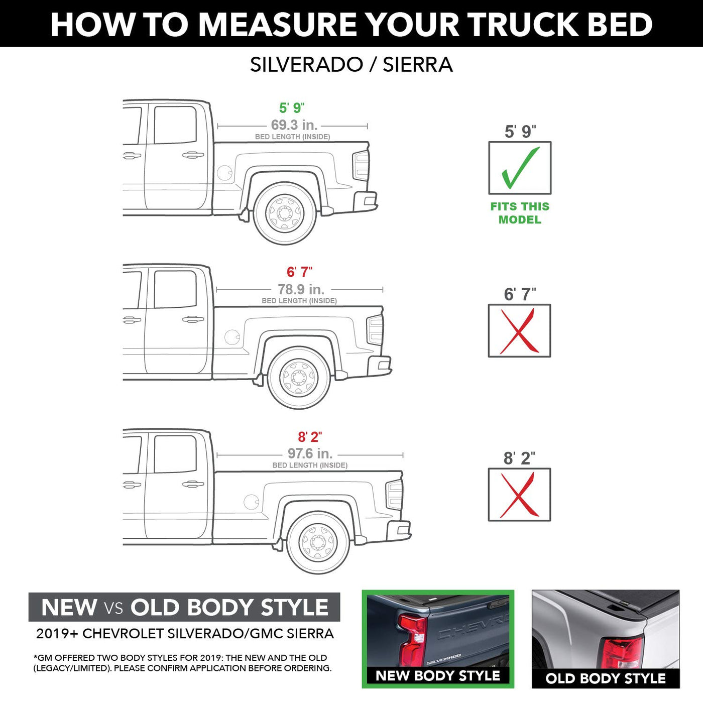 Q: What trucks is the RealTruck UnderCover LUX Tonneau Cover compatible with?A: The RealTruck UnderCover LUX Tonneau Cover is designed to fit 2014 - 2018 models and the 2019 Limited GMC Sierra 1500 with a 5' 9" bed (69.3 inches), specifically for models with the GBA color code (WA8555).