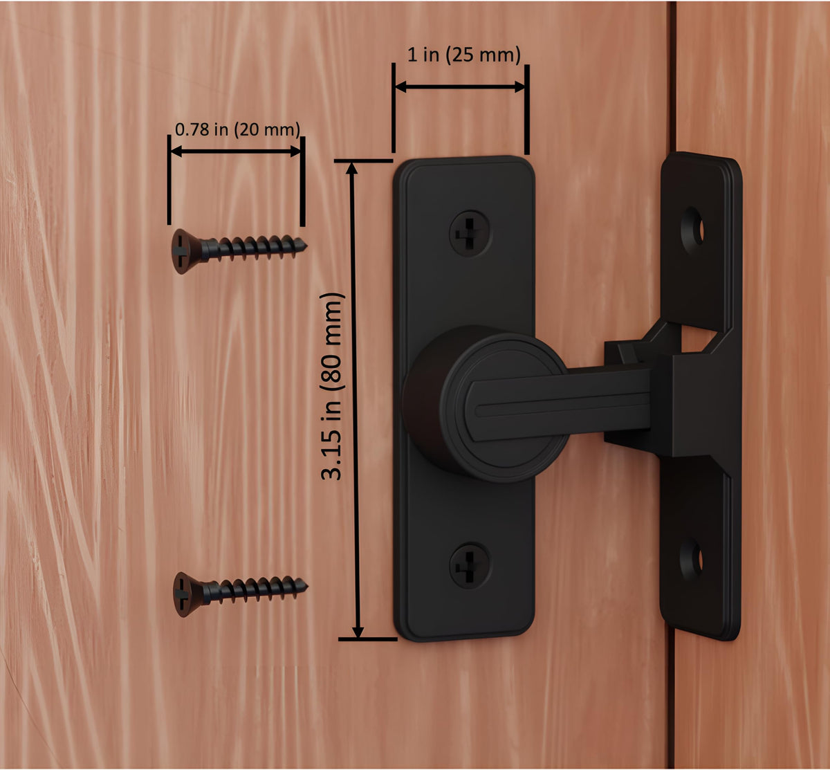 Zinc alloy material; Durable and long-lasting use; Corrosion and abrasion-resistant; Includes 4 stainless steel screws without dowels; Easy installation; 90-degree locking angle; Stylish and modern aesthetics; Can be used at home, office, garage, barn, shed, and more; Can’t be opened from the other side; Secure hold for enhanced safey; Size: 0.98 x 3.14 x 0.16-inch;