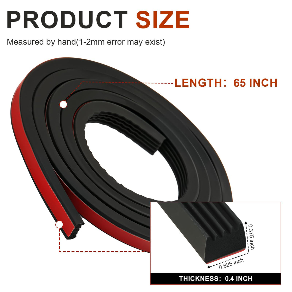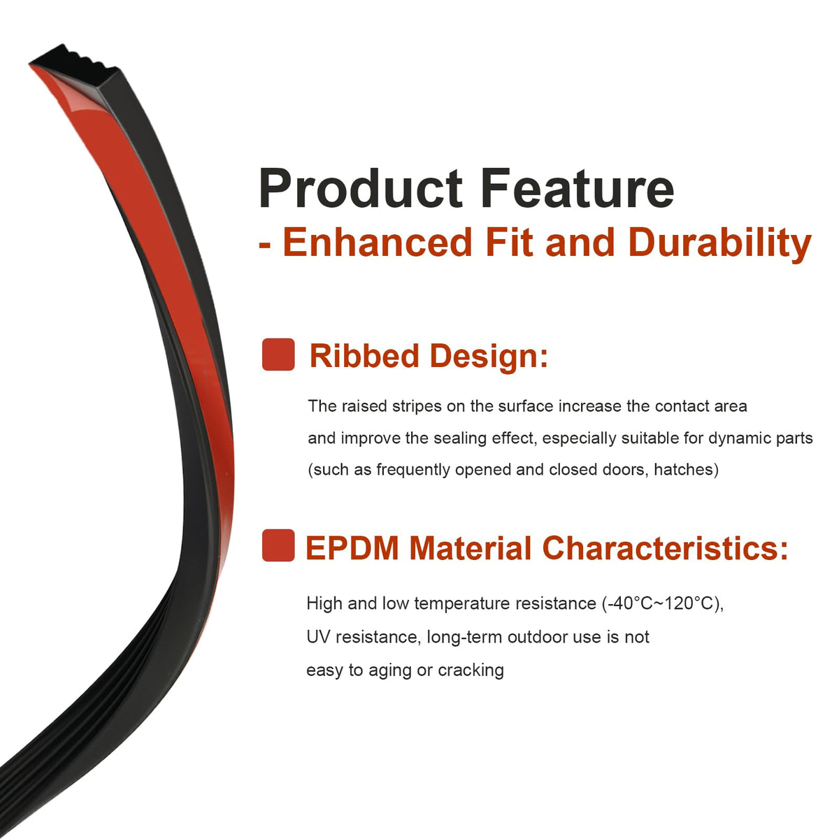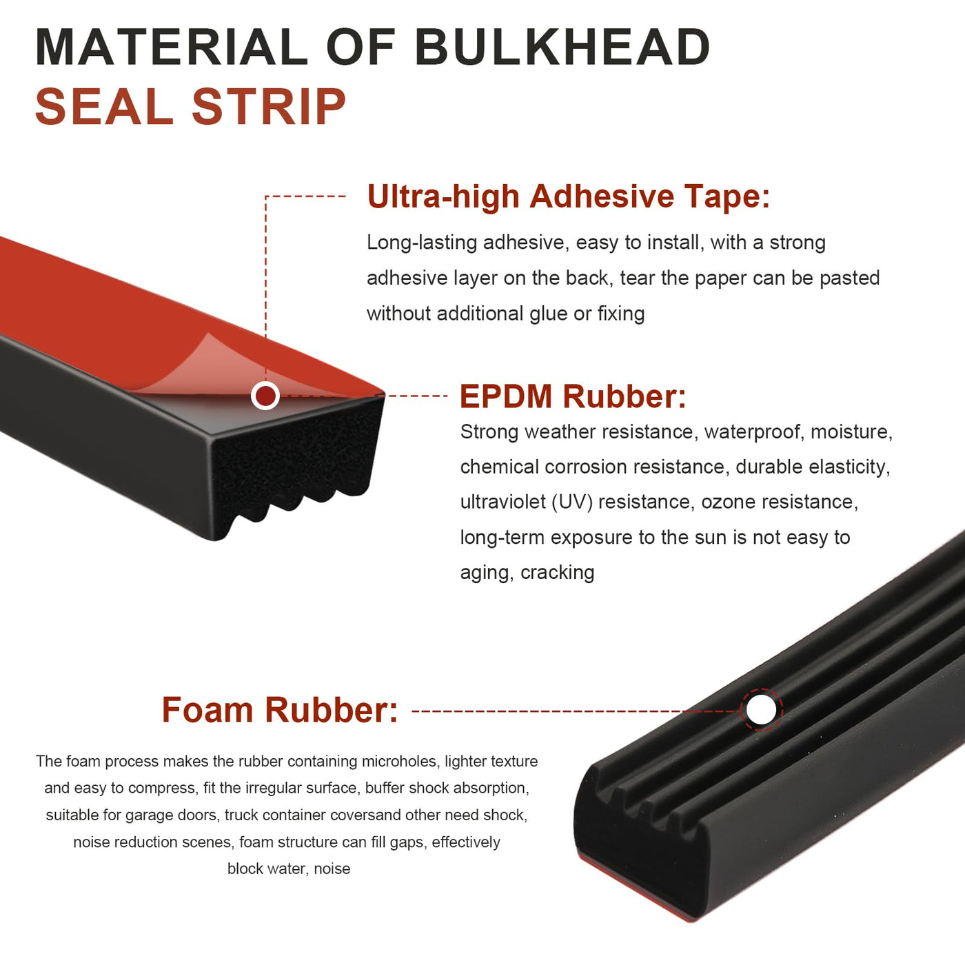 Material of Tonneau Cover Bulkhead Seal StripUltra-high adhesive tape, EPDM foam rubber which has weather resistance (UV resistance, high and low temperature resistance), waterproof and buffering propertiesRibbed DesignThe ribbed rectangular design of the marine weather seal stripping provides a multi-layer seal with multiple raised stripes, effectively blocking moisture, noise and air infiltration, as well as acting as a shock absorber Applications for RV/Truck Tonneau Cover/AutoMulti-functional self-adhesive rubber bulkhead weather sealing strip, designed for truck tonneau cover, and perfect for rv door/window, boats, all kinds of auto, garage doors and other need wind and rain, shock absorber and sound insulation dynamic sealing sceneEPDM Foam Rubber Bulkhead Seal StripHigh and low temperature resistance (-40C~120C), UV resistance, long-term outdoor use is not easy to aging or crackingSize of Tonneau Cover Weather StrippingWidth of truck bed seal is 3/5 inch, thickness is 0.4 inch, and the Overall length is 65 inch