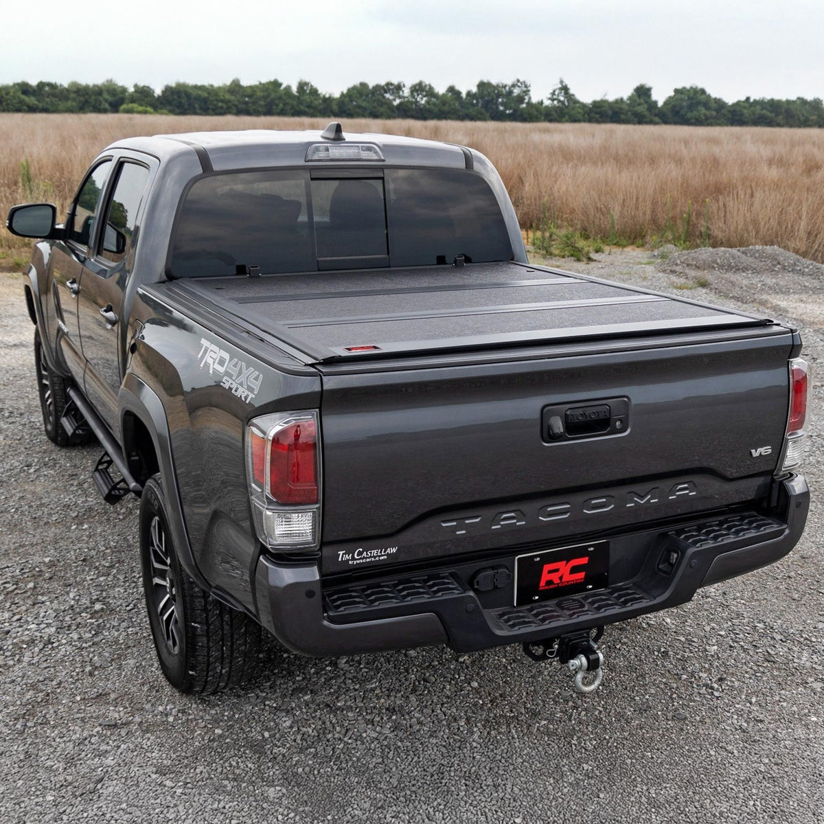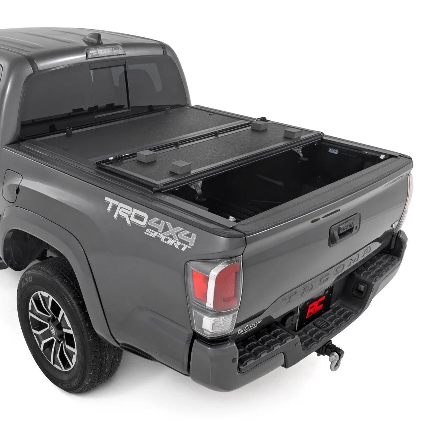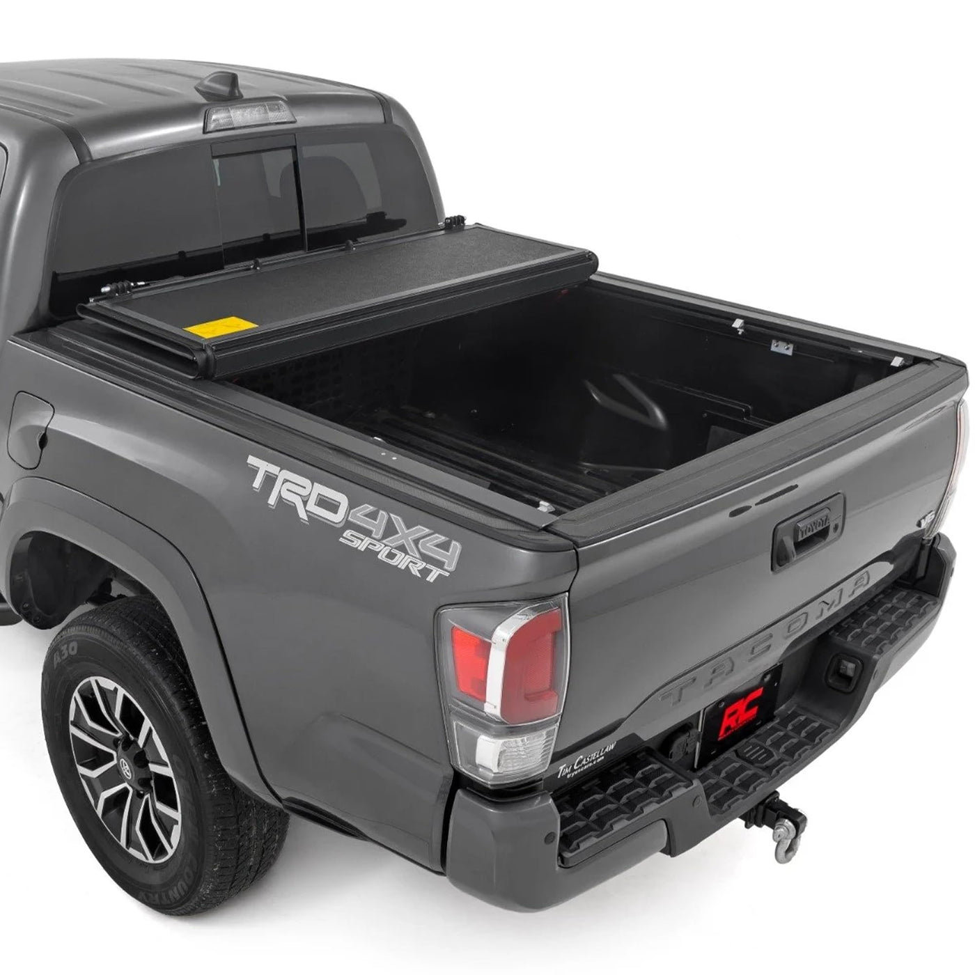 Rough Country's Hard Low-Profile Bed Cover is built for adventure. This tri-fold tonneau cover delivers a streamlined design that enhances your truck's off-road look while safeguarding your gear. Enjoy the peace of mind that comes with Rough Country's quality construction and easy access features. Here's what makes this tri-fold tonneau cover the ultimate winner:Low Profile, Sleek Look: Ditch the bulky covers! Our low-profile design seamlessly integrates with your truck bed, adding a touch of style without compromising sacrificing function.Folds for Easy Access: Need to grab your gear in a hurry? No sweat! This tri-fold design lets you open the cover partially or fully in seconds, so you can access your truck bed whenever you need to.Extra Security: Worried about leaving your tools or weekend essentials behind? This cover integrates with your truck's tailgate lock, so you can relax knowing your gear is safe from prying eyes.Easy Does It Installation: We get it; you'd rather be out on the trails than wrestling with instructions. That's why our Bed Cover is designed for a simple, hassle-free installation. You'll be cruising with newfound bed security in no time!Built to Last: Rough Country backs this tonneau cover with a 5-Year Warranty, so you can rest assured it's ready to conquer any adventure.Streamline your truck bed, secure your gear, and hit the trails with peace of mind. Rough Country's Hard Low-Profile Bed Cover is the perfect solution for those who demand both style and functionality. Note: Fits Toyota Tacoma 2WD/4WD models with 5' / 60.5'' bed length.