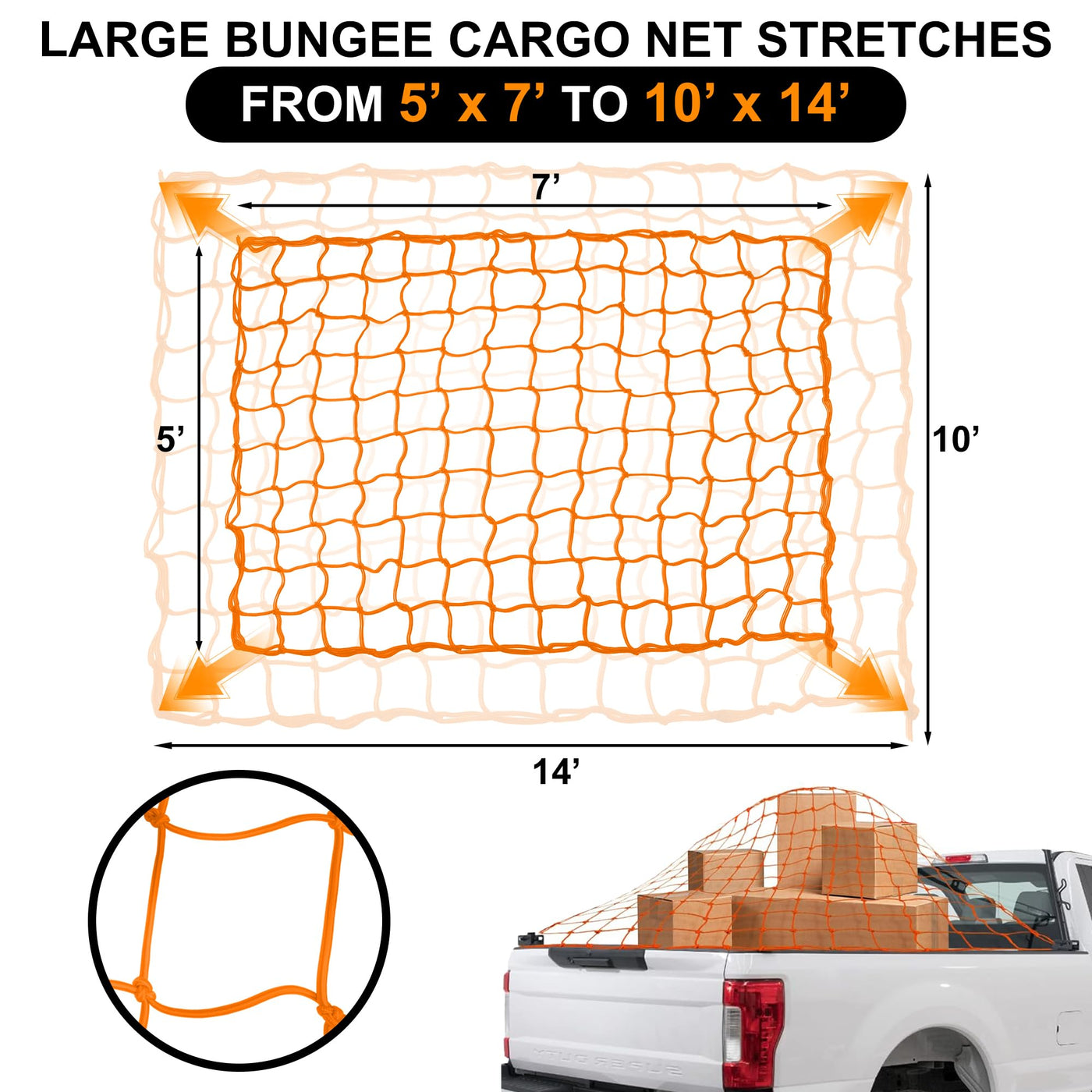 Seven Sparta 5 X 7 Bungee Cargo Net Stretches To 10' X 14' For Truck Bed, Pickup Bed, Trailer, Trunk, Suv With 16 Bonus D Clip C