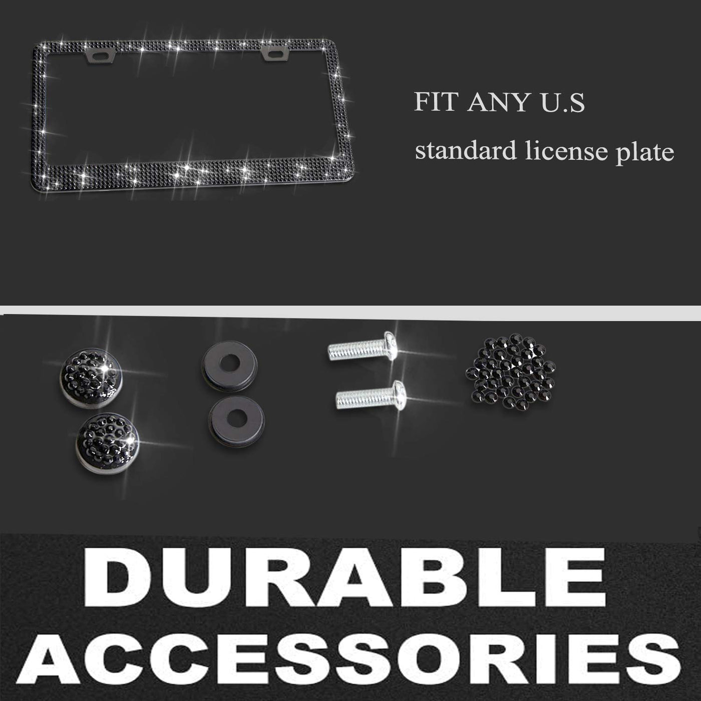 Shering Bling Glitter License Plate Frame - Perfect Gift for Any Occasion Add a touch of glamour to your vehicle with the Shering Bling Glitter License Plate Frame. This dazzling frames is designed to instantly transform the look of your car, making it a stylish statement on the road. Key Features: Sparkling Elegance: Each frame is adorned with premium-grade crystal rhinestones, ensuring a brilliant sparkle that mimics the allure of diamonds. Elevate your car 's appearance with this eye-catching accessory. Perfect Gift: This bling license plate frame is more than just an accessory; it 's a thoughtful and warm gift for friends and family. Ideal for Christmas, birthdays, or any special occasion, it adds a touch of luxury to their vehicle. Complete Set: The package includes 1 License Plate Frames, along with 2 Screw Caps, 2 Self-tapping Screws, 2 Machine Screws, 2 Washers. Everything you need for easy installation is included. Universal Fitment: Designed to fit all US standard license plates, the thin bezel design ensures that state tags won 't be obstructed. Enjoy a hassle-free upgrade that adds a touch of bling to any vehicle. Installation Instructions: Place the frame on your license plate. Secure it with the provided self-tapping screws and machine screws. Complete the look with the matching bling screw caps. Upgrade your car 's style and surprise your loved ones with the Shering Bling Glitter License Plate Frame. Order now and let the road shine with elegance and glamour! ?????