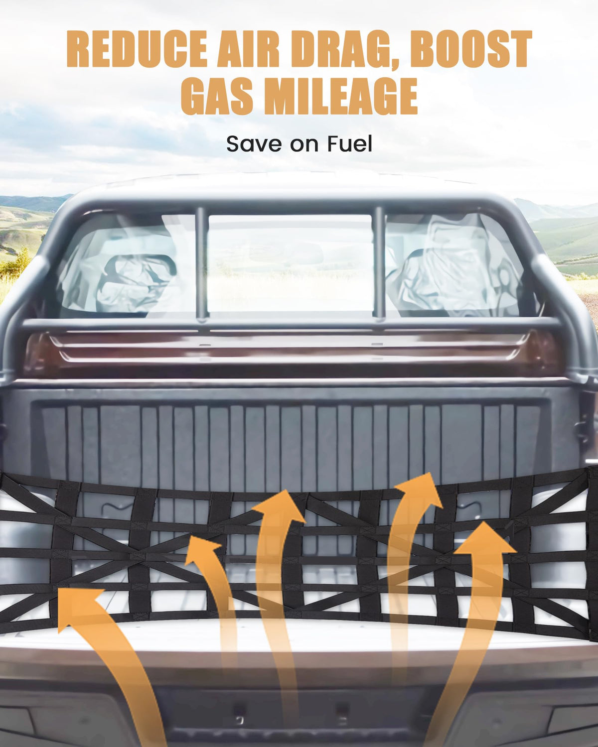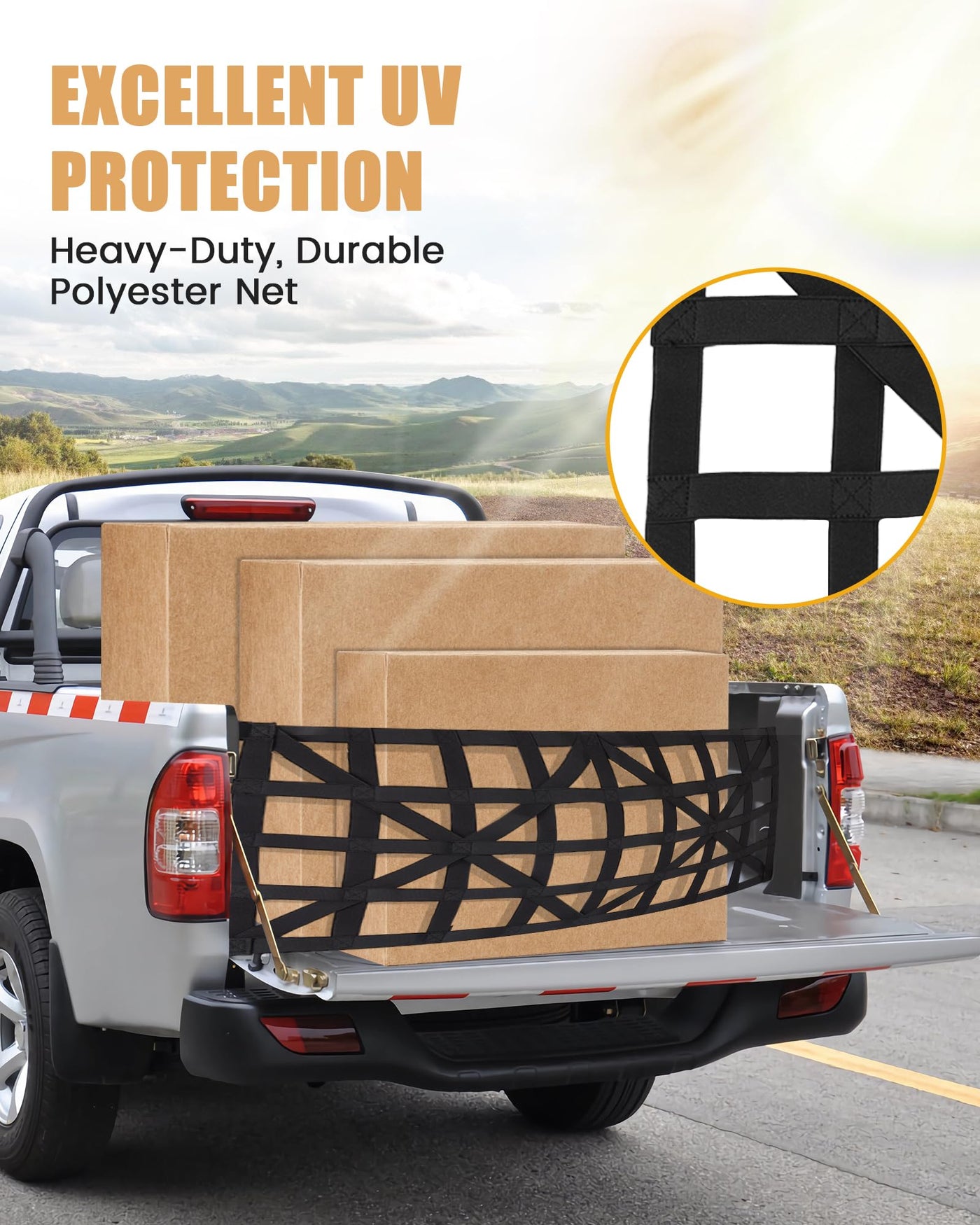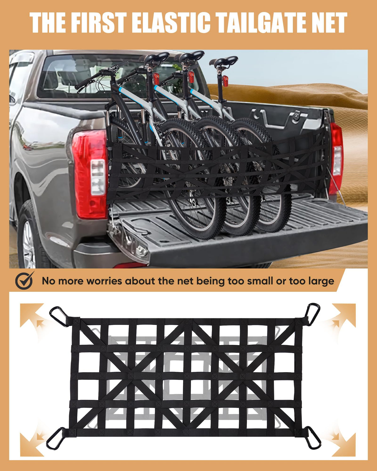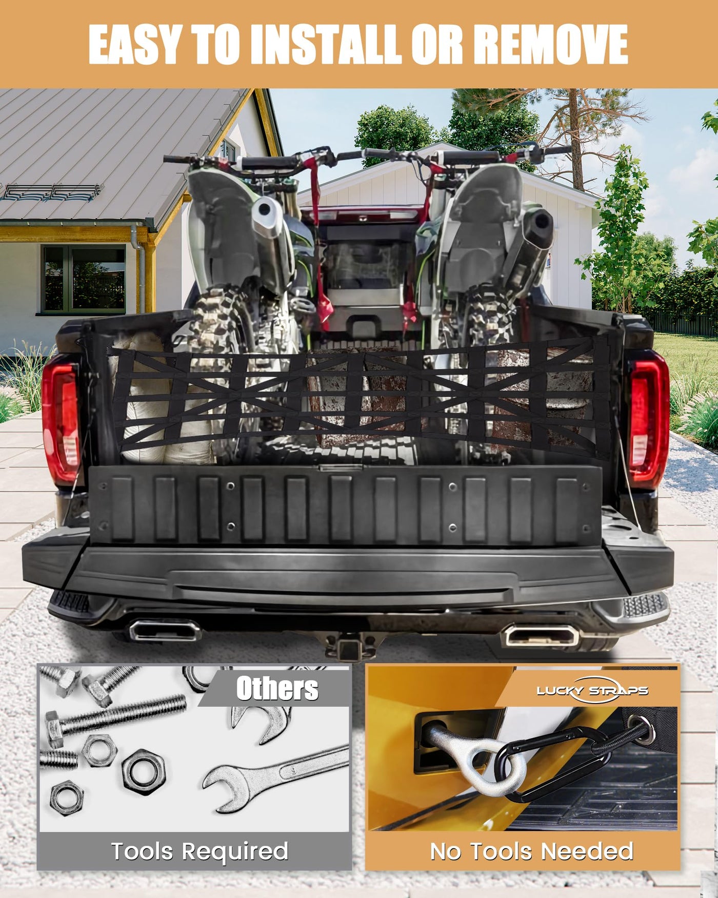 LUCKY SRTAPS Elastic Tailgate Net for All Pickup Truck Bed SizesTHE FIRST ELASTIC TAILGATE NET ON THE MARKETFits all pickup sizes, from small to full-size trucks. No more worries about compatibility. EASY TO INSTALL & REMOVENo tools required. Unlike other products, installation takes just seconds by hooking the four carabiners onto tailgate anchors. EXCELLENT UV PROTECTIONBuilt for outdoor use, our premium polyester resists UV wear for longer durability, unlike degradable nylon that fades and weakens in sunlight. ECO-FRIENDLY EFFICIENCYReduce drag with the LuckyStraps Tailgate Net, improving fuel efficiency, saving money, and reducing pollution. VERSATILE USEIdeal for securing kayaks, motorcycles, cargo, furniture, and more. WHAT YOU GET Elastic tailgate net x 1 and heavy-duty carabiner hook x 4.