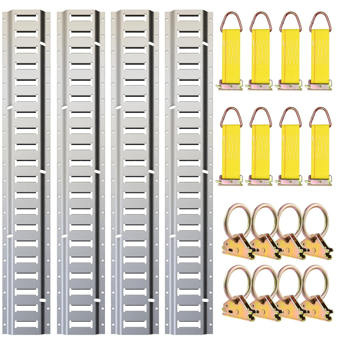 Trekassy 8ft Horizontal E-Track Tie-Down Rail Kit with 8 Steel O-Ring Anchors and 8 Rope Tie Offs for Truck Bed, Trailers- Silver. E track rails are highly versatile, as they can be mounted vertically or horizontally on a variety of surfaces, such as the walls, floors, or ceilings of cargo vans, trailers, or shipping containers. This flexibility makes them ideal for a wide range of transportation applications, from hauling furniture and appliances to moving heavy machinery or construction equipment.