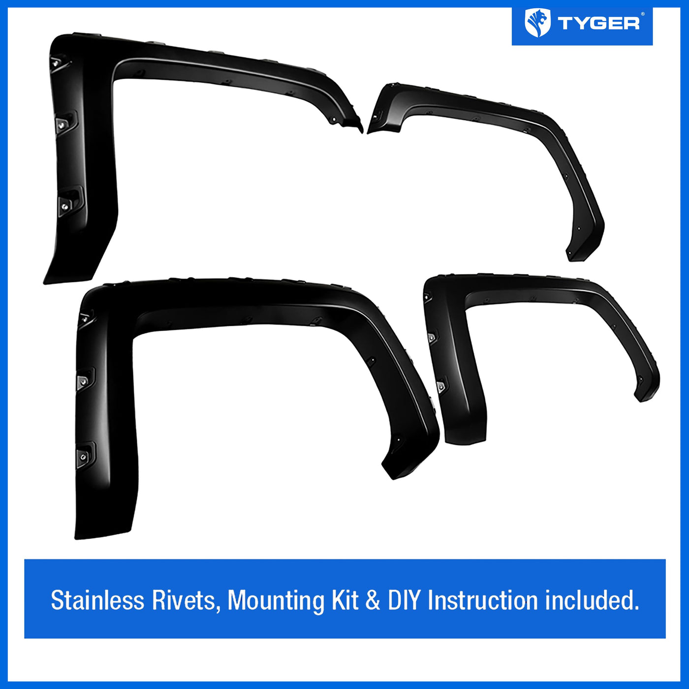Fitment - Compatible With 2014-2018 Chevy Silverado 1500; 2015-2019 Silverado 2500 3500Hd 6.5' & 8' Bed | Not Compatible For Gmc Sierra; 5.8Ft Short Bed Models | Not Compatible For Dually Models | Mud Flaps Removal Are Required Prior To Installation | Compatible With Aftermarket Bumpers | Finish - 4Pc Paintable Smooth Textured 100% Uv-Resistant Fender Flares | Flare Height: 6.5' In Front And Rear Tire Coverage: 2' In Front And 1.75' In Rear | Heavy Duty - Special Injection Molding Process Ensures Enhanced Durability, Flexibility And Strength For These Flares To Effectively Withstand Against Cracking, Warping And Chalking Offering A Superior Off-Road Driving Experience. | Easy Installation - Mounting Instruction And Hardware Kit Included; Average Install Time 2+ Hours | Minor Drilling | Tyger Warranty - Limited Lifetime Warranty For Us Customers Against Cracking, Warping Or Any Other Factory Defects.