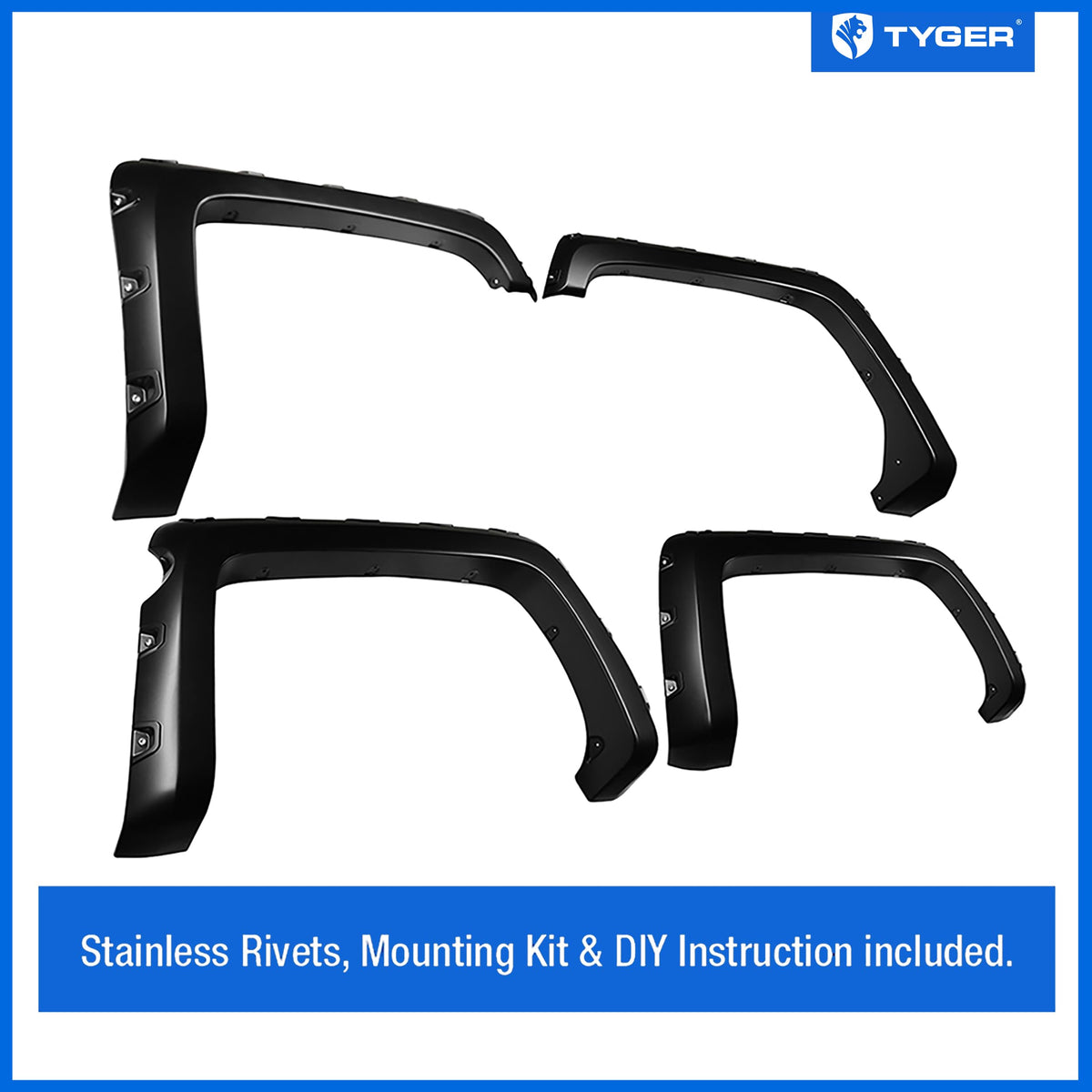 TYGER fender flares are made of impact-resistant polypropylene with developed injection molding technology. The pocket bolt-on riveted style gives your pickup a customized off-road look and adds significant tire coverage to keep dirt and debris off the vehicle! Fitment 2014-2018 Chevrolet Silverado 1500; Only fit models with fleet side 5. 8' short bed; IMPORTANT: Will NOT fit Sierra; Compatible with aftermarket bumpers; Not compatible with mud flaps; Please make sure your vehicle satisfies all above requirements before ordering!