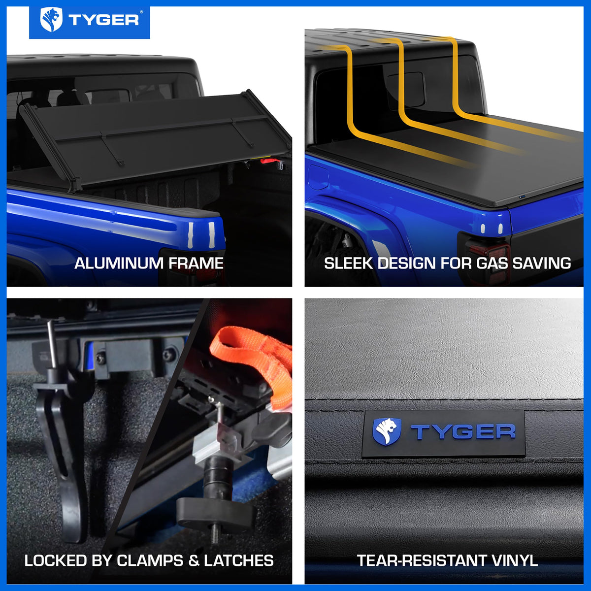 Tyger Auto T3 Soft Tri-fold Tonneau Cover is designed as much to be any new truck owners' first tonneau cover as well as heavy duty users who need access to their truck bed on a daily basis. T3 is the easiest bed cover in the market in terms of installation and operation. It can be done in just 5-10 min by simply applying the clamp and latch system to the bed rail without sacrificing any protection of your cargo and the quality of its construction; while maintaining its sleek design and great gas saving.