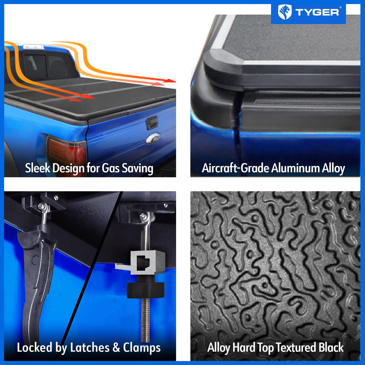 Tyger Auto's T5 Alloy Hard Tri-fold Tonneau Cover is in a class of its own. This premium cover is designed for users who seek a hard top option that is made with aircraft grade material which is equally light-weight and durable, ensuring that your truck bed and its valuable cargo will be protected against all types of weather elements all year round. T5 only requires an easy, no-drilling installation and is equipped with an unique quick-release latch system entrusting it with maximum security to safeguard against theft.