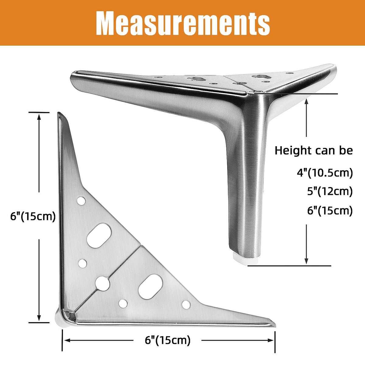 Q: What are the dimensions of the VEHCIL 6-inch furniture legs?A: The VEHCIL furniture legs come in three dimensions: 6" x 6" x 4", 6" x 6" x 5", and 6" x 6" x 6".