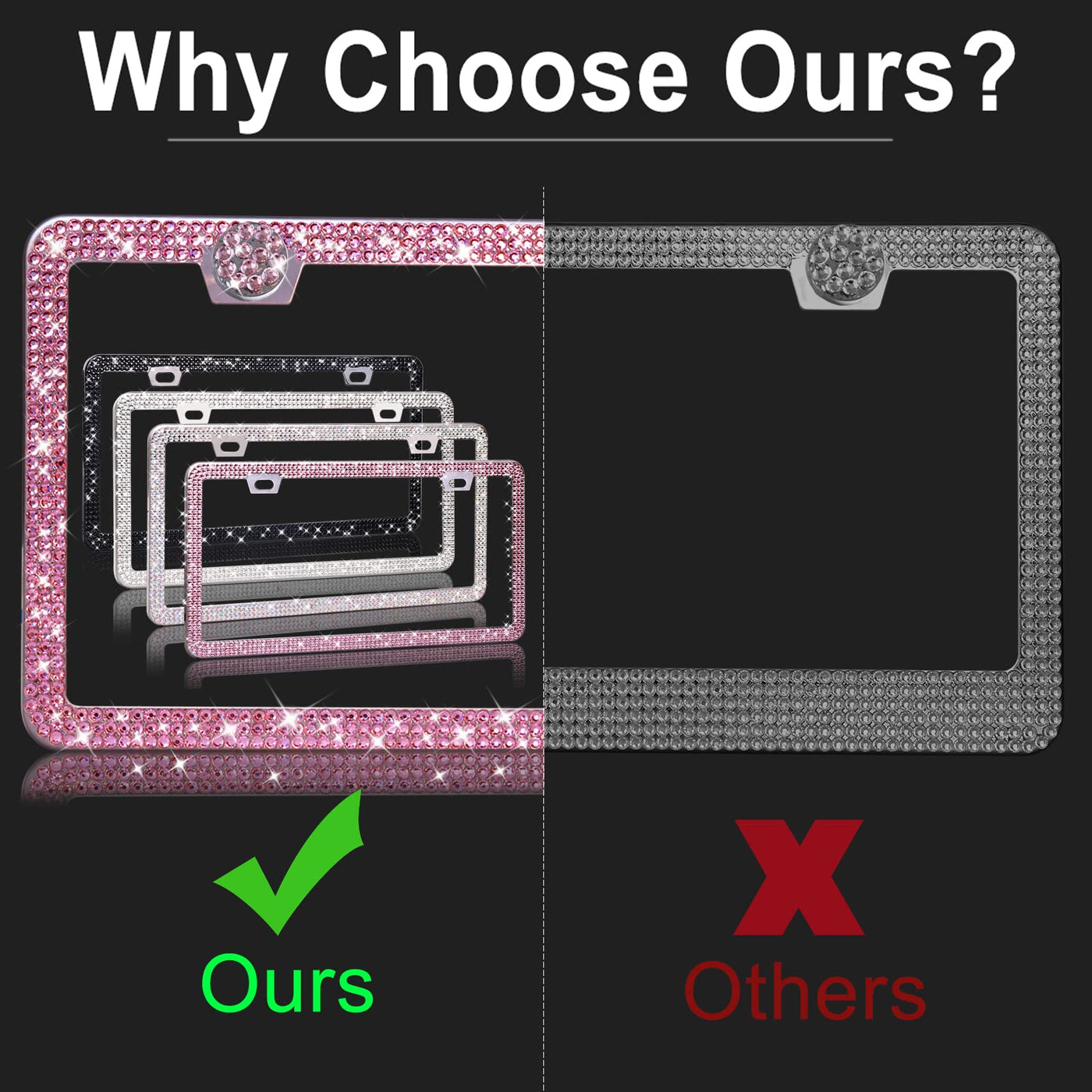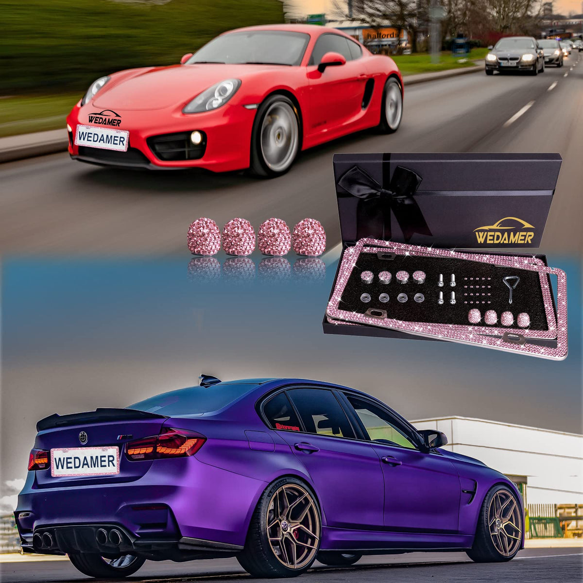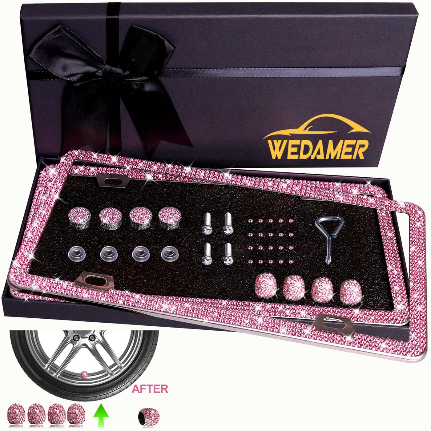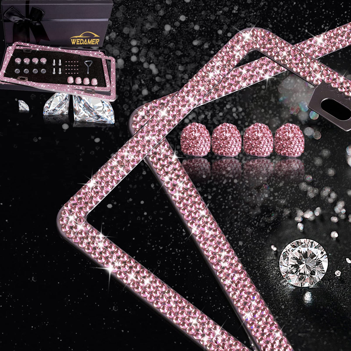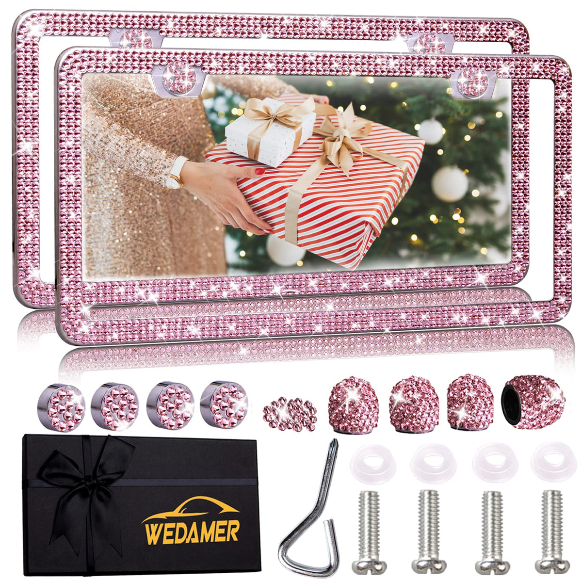 2 Pack Pink license plate frame Bling Rhinestone Car License Plate Covers & Frames Chrome for Women Pink Rhinestone License Plate Frame Sparkly Diamond Stainless Steel License Plate Holder for Car Glitter Crystal Car Tag Frame Pink dice for car Hot Pink car accessories for women Girls Pink Car Decorate, Glass Crystal Frame Thin Car Plate Frame( 2 Pack-Giftbox ) Blinged out car accessories for Women Black Bling License Plate Frame, excellent design decorate your car cool and shining with beautiful dazzling, black sparkle license plate frame catch everyone's eyes on the road, its all the bling and vitality that you wanted, rhinestone plate frame Clear Rhinestones License Plate Frame Holder, sparkles in the sun or light, cutting-edge premium glass crystals not easily faded or turned yellow, shine brightly unique luxury looks fantastic on your car, blinged license plate frames, glitter car accessories diamond plate Iridescent Diamond License Plate Frame Cover, stunning and shiny color that changes with the light, not white or clear, sometimes looks kind of yellow coming from one direction and more colorful from the other direction, sometimes look pink, purple, teal, clear- depending on the angle Size of Liense Plate Frames bling: 12.8inch x 6.2inch x 5inch Package Weight: 0.47kg, 2 Pcs rhinestone tag plate frame Package Includes: 2 x Womens license plate frame 4 x Standard Screw 4 x Crystal Caps 4 x Washers 1 x Screwdriver 1 x User manual 4 x extra Bling Tire Valve Stem Caps Some extra Spare diamonds