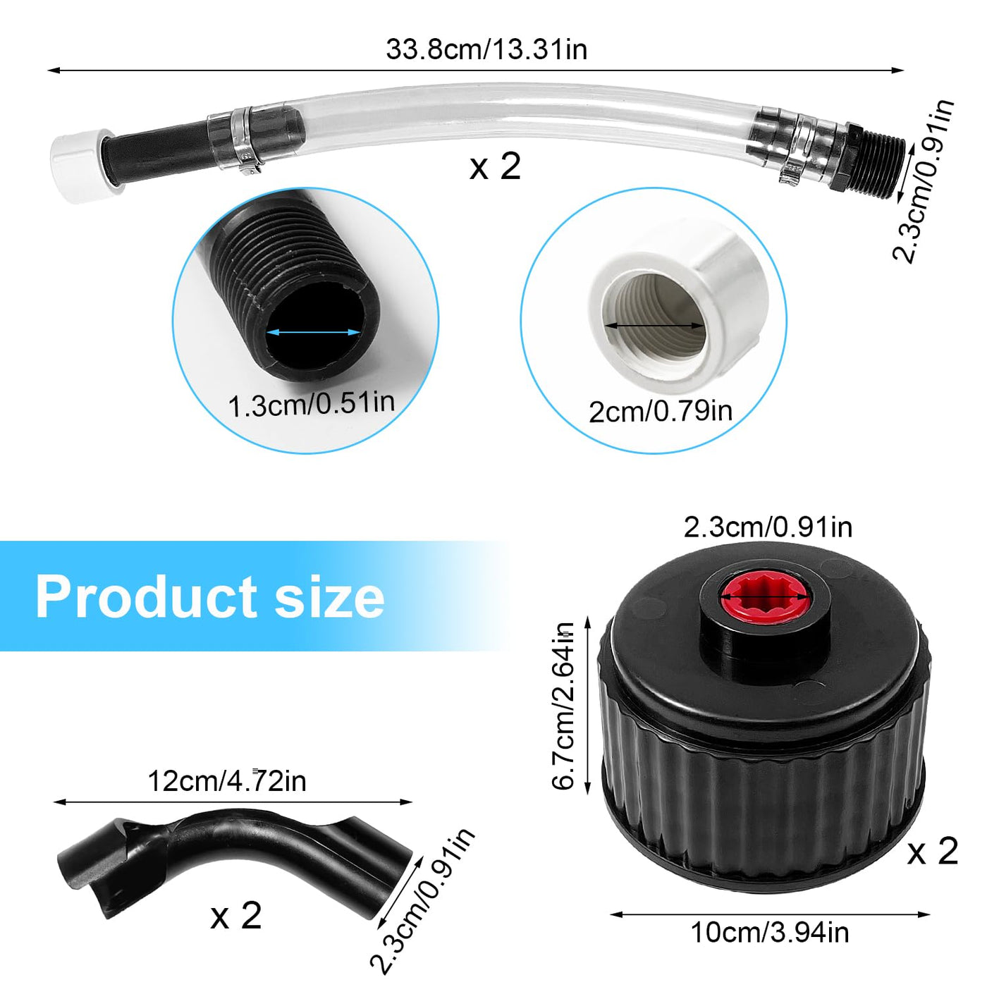 Size: 14.4 * 1.2 * 1.2 Inch You Will Receive: 2 Racing Hoses, 2 Jug Replacement Caps, 2 Hose Benders
