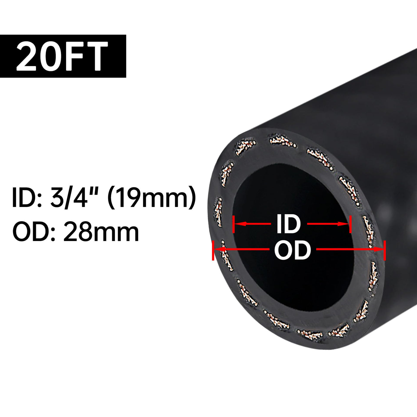 Q: What are the dimensions and weight of the EVIL ENERGY Fuel Transfer Hose?A: The hose has an inner diameter of 3/4 inch (19mm), an outer diameter of 28mm, and a length of 20 feet (6m). It weighs approximately 9.59 pounds, making it manageable for transport and use.