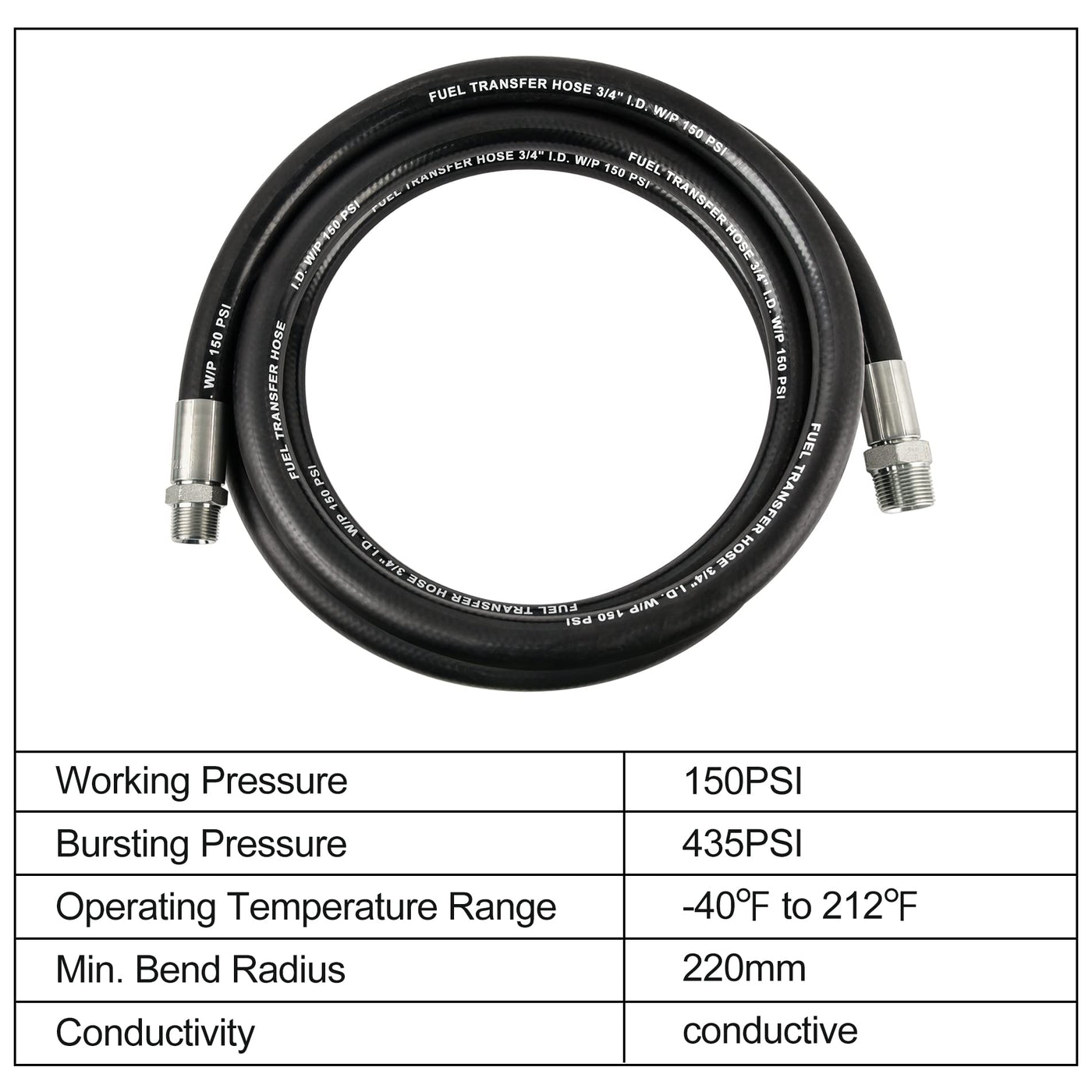 Q: What is the maximum working pressure of this fuel transfer hose?A: The maximum working pressure of the EVIL ENERGY 3/4" Fuel Transfer Hose is 150 PSI, ensuring it can handle significant pressure during fuel transfer.