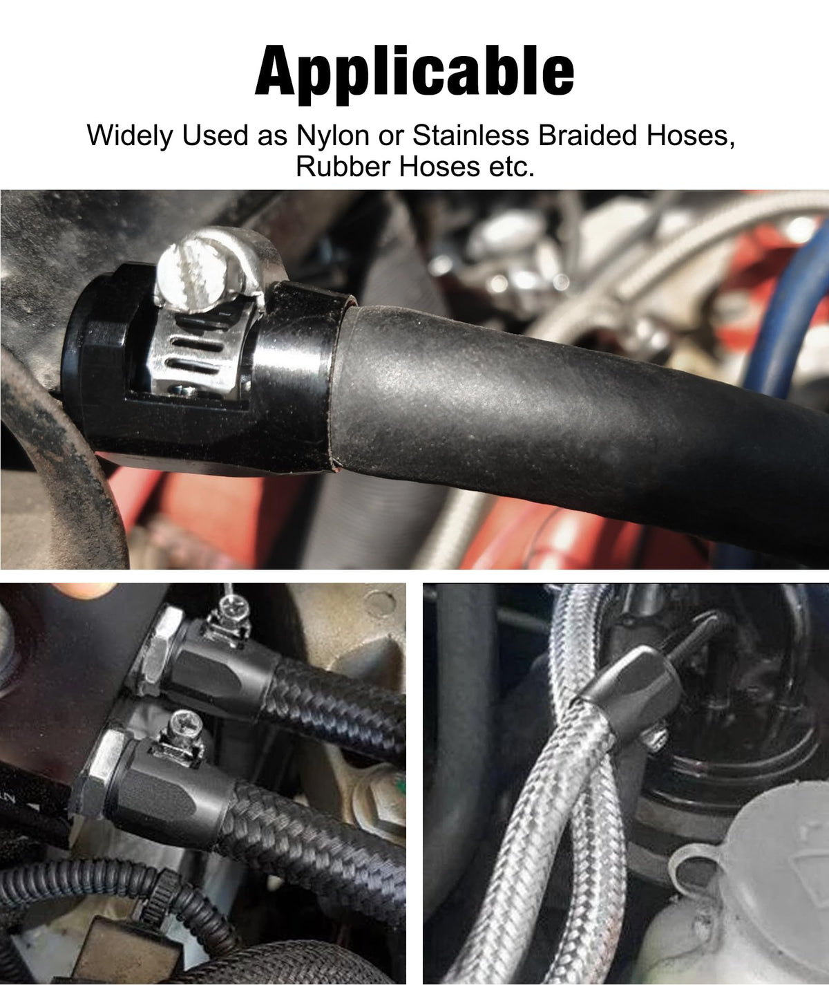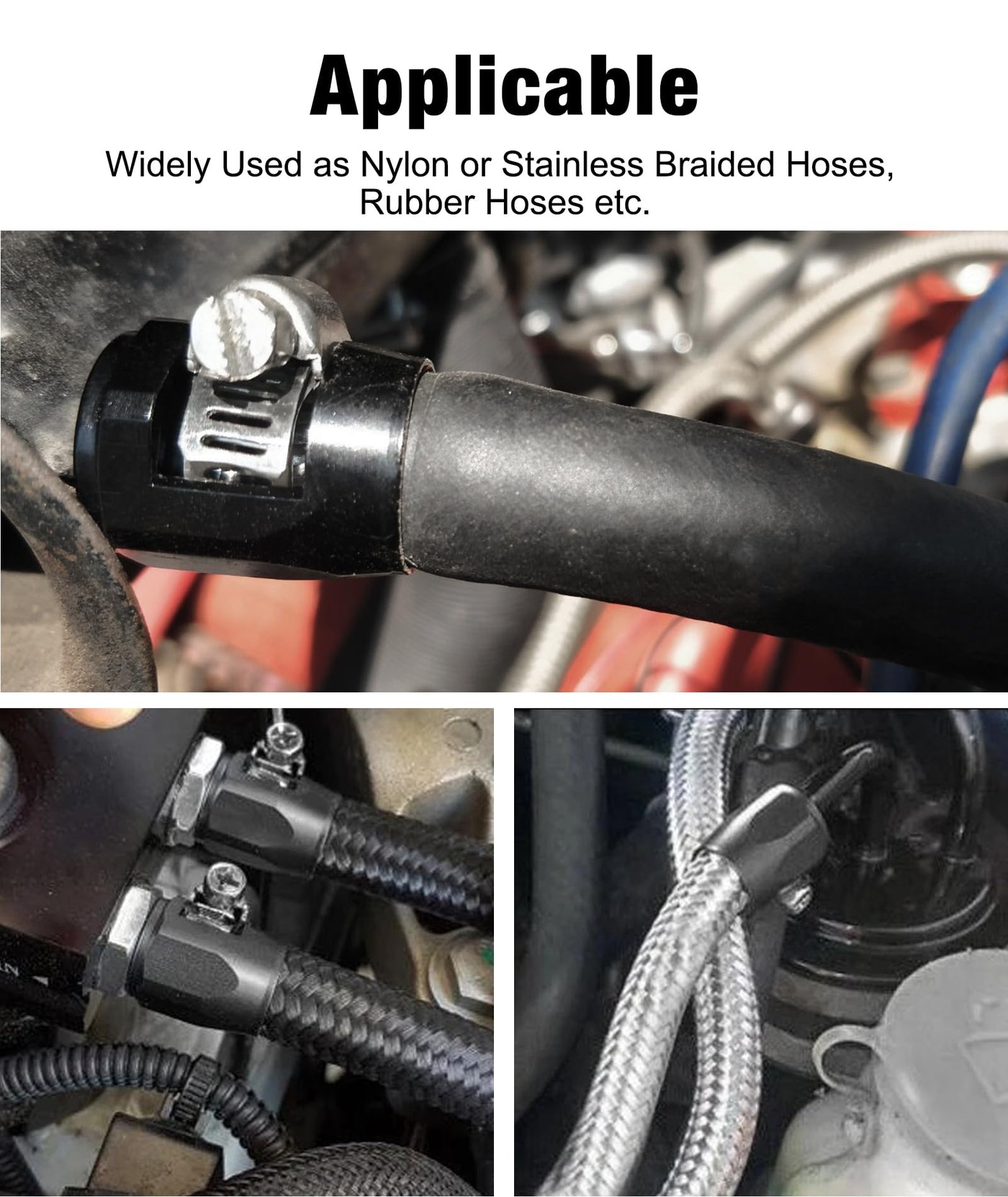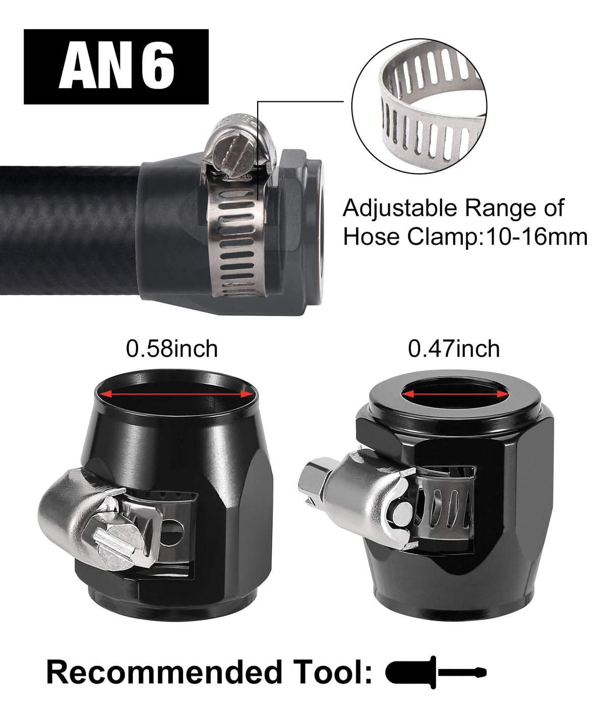 Q: What size hoses are compatible with the EVIL ENERGY 6AN Hose Finisher Clamp?A: The EVIL ENERGY 6AN Hose Finisher Clamp is adjustable and fits hoses with an outer diameter of 10-15mm (0.39"-0.59"). It's important to measure the OD of your hose before purchasing to ensure a proper fit.