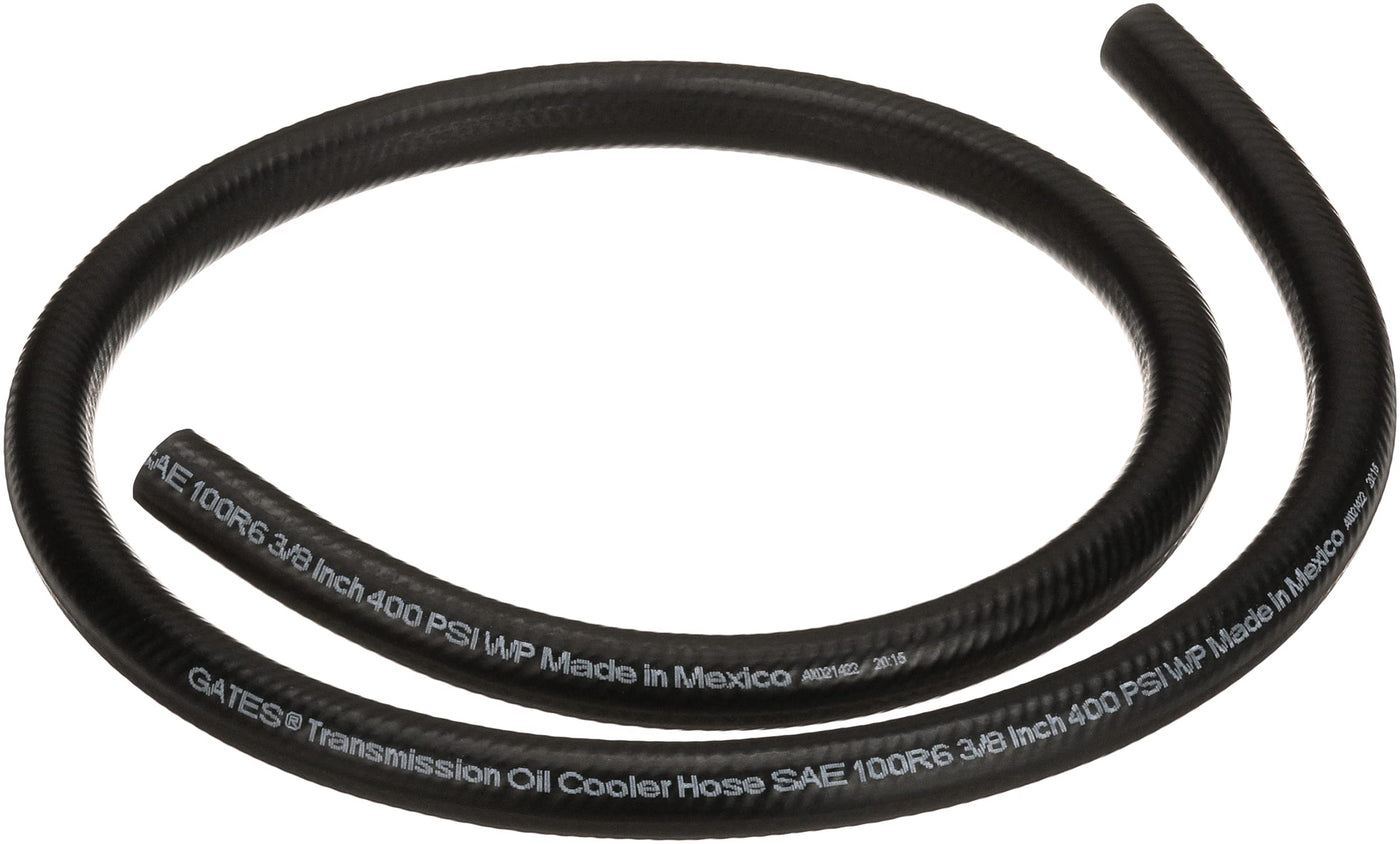 Gates Transmission Oil Cooler Hose is engineered with a synthetic rubber tube and an oil- and abrasion-resistant black CSM cover to provide a safe heat, ozone and chemical-resistant connecting line between the oil cooler and transmission.
