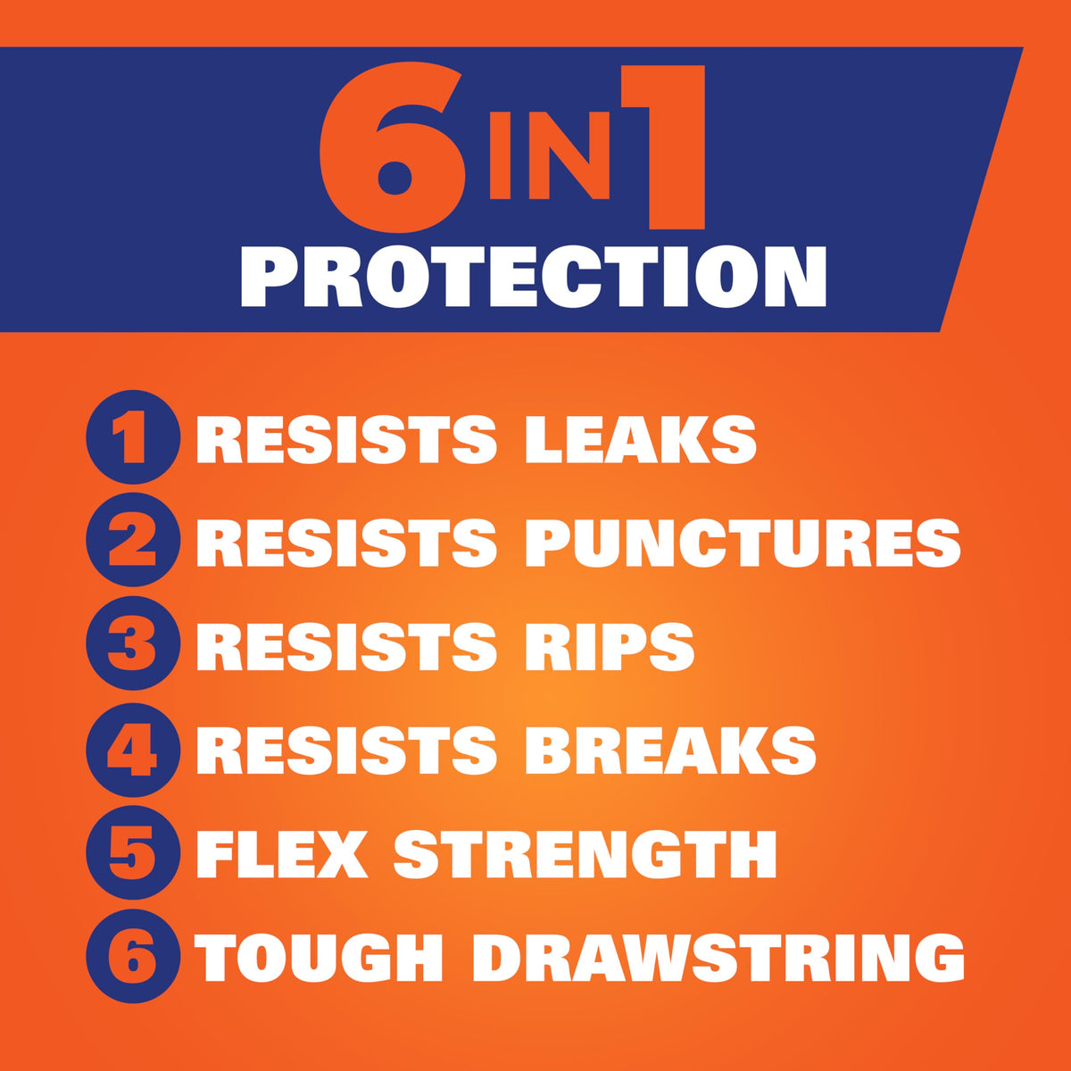 Thick, Strong, And Stretchable. 20% Thicker Than Most Other Tall Kitchen And 30 Gallon Trash Bags. Ultra Thick Plastic For Ultra Strength With Interlocking Texture Design. Puncture Protection To Dramatically Reduce The Likelihood Of Tearing Or Ripping. No. 00638: 24'' X 27.375'', 13 Gallon Capacity, 1.1 Mil, 38 Bags Per Box, White, Drawstring Tall Kitchen Bags No. 20625: 30'' X 34'', 30 Gallon Capacity, 1.3 Mil, 25 Bags Per Box, Black, Drawstring Large Kitchen Bags No. 03915: 33'' X 41'', 39 Gallon Capacity, 1.3 Mil, 16 Bags Per Box, Black, Drawstring Clean Up Bags