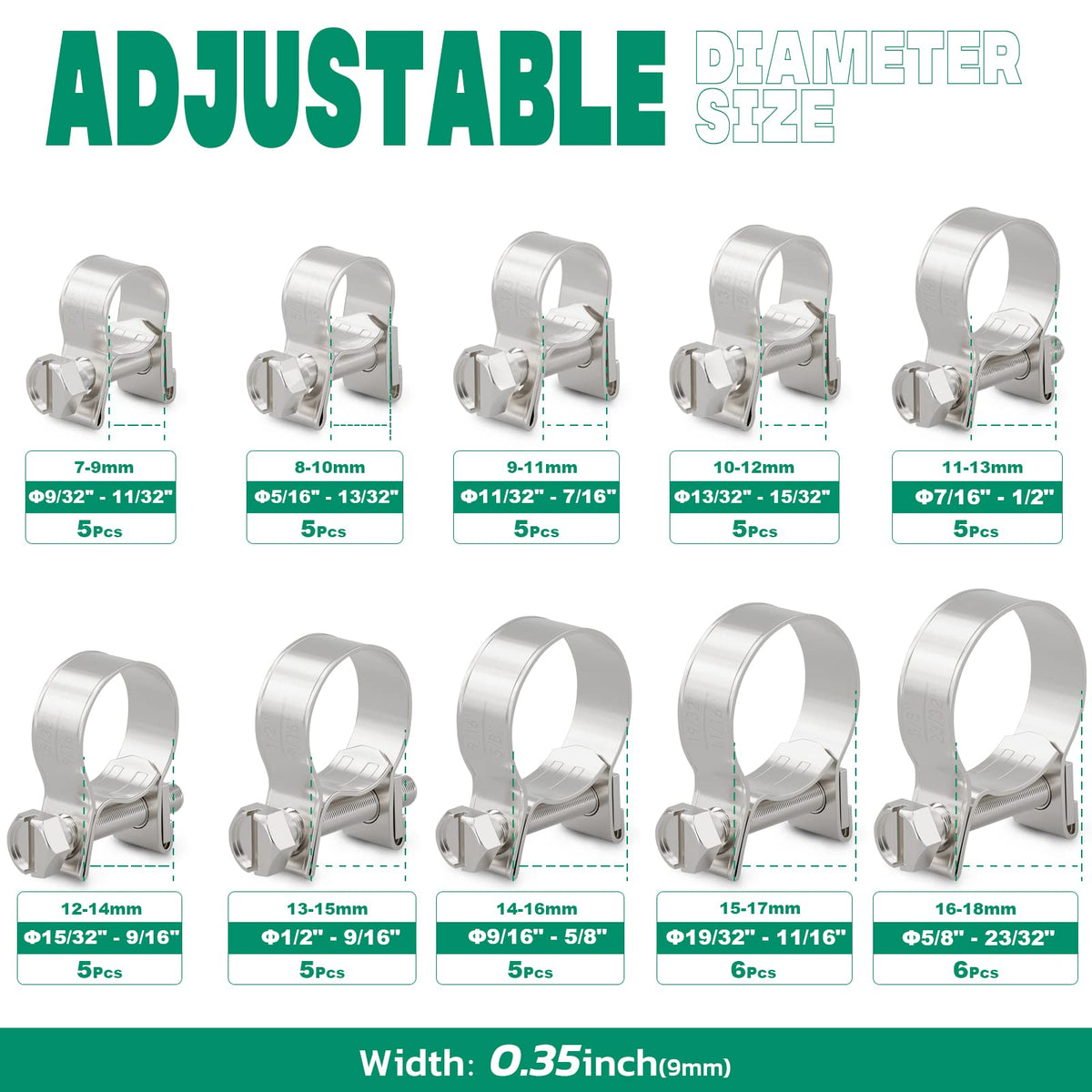 OURU 52PCS Fuel Line Clamp Assortment Kit 304 Stainless Steel,10 Sizes Adjustable 9/32''-23/32'' Dia (7-18mm) Mini Fuel Injectio