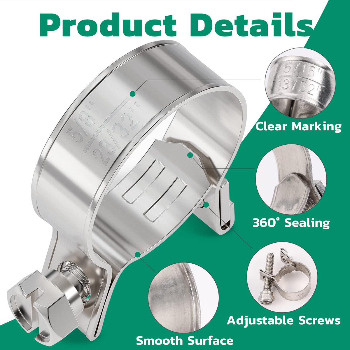 Product Specification: Brand: OURU Type: Fuel injection hose clamps Color: Silver Material: All 304 Stainless Steel Range Size: 5PCS 9/32-11/32(7-9mm) 5PCS 5/16-13/32(8-10mm) 5PCS 11/32-7/16(9-11mm) 5PCS 13/32-15/32(10-12mm) 5PCS 7/16-1/2(11-13mm) 5PCS 15/32-9/16(12-14mm) 5PCS 1/2-9/16(13-15mm) 5PCS 9/16-5/8(14-16mm) 6PCS 19/32-11/16(15-17mm) 6PCS 5/8-23/32(16-18mm) Width: 0.35 /9mm Quantity of tiny hose clamps: 52 pcs Thickness:0.6mm Advantages: Anti-rust, anti-corrosion, good sealing, smooth, strong and durable WARM TIPS: 1.Please use correct installation tool. 2.The inches we have marked refer to the outside diameter of the pipe.NOT FOR CIRUMFERENCE.Please measure the pipe and choose the right size metal hose clamp for the pipe. Feature: 1.52pcs small hose clamps are packed in a box that is easy to store and carry; 2.The hose clamps heavy duty are all made of 304 stainless steel (Includes screws and nuts),ensure long-lasting use for outdoor; 3.Our mini gas line clamps are reinforced and widened to be very strong and will not cause deformation or breakage during use; 4.Easy to use,the fuel injection hose clamps with adjustable screws,just need use a screwdriver to adjust the size; 5.The mini fuel line clamps has 360sealing construction can effectively solve the problem of air or liquid leakage from the hose; 6.The surface of mini fuel hose clamp is smooth and burr-free,which can prevent the clamp from cutting off the hose.Dont worry about deforming or stripping out after tightening; 7.The hose clamps for gas line,air hose,water pipe,fuel hose,silicone hose,etc.Widely used in industrial,electronic,automotive,fuel and other plumbing applications; Package Included: Package Including:52pcs Coolant Hose Clamp Assortment Kit