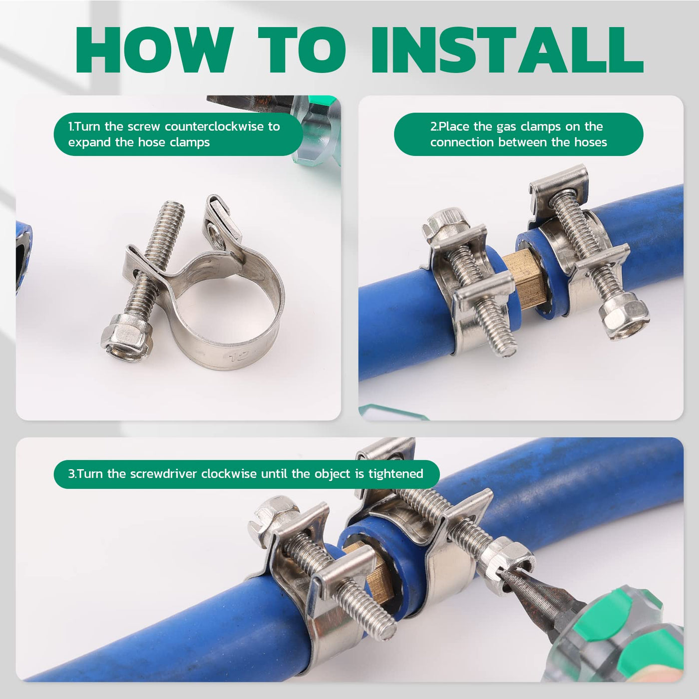 Q: How do I install the hose clamps correctly?A: To install the hose clamps, simply use a screwdriver to adjust the size according to the pipe's diameter. Ensure that you measure the outside diameter of the pipe to choose the right size clamp for a secure fit.