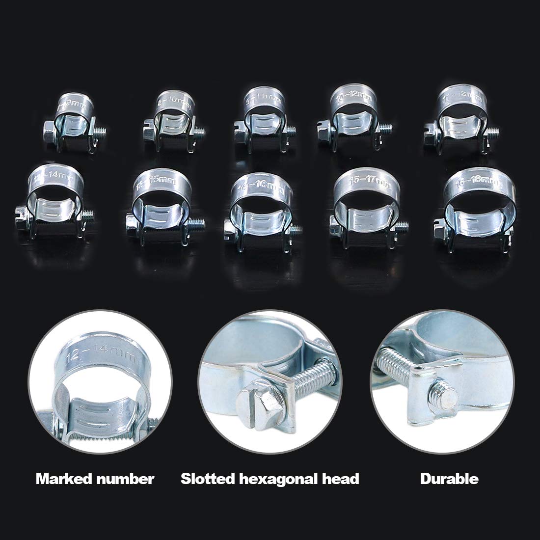 ? Swpeet 120Pcs 10 Sizes Mini Fuel Injection Line Style Hose Clamp Assortment Kit WHY CHOOSE US? ? 1, Hose clamps are flexible and ductile with wide adjustable size range. A worm gear mechanism adjusts the clamps diameter to precisely apply sealing pressure. ? 2.They are easy to tighten and loosen and they are made of from zinc plated steel for durable long life. ? 3, The product is used in auto and Motorcycle. Dragging, machinery oil, water, gas, which makes the pipe joint seal more firmly! ? Specifications: ? Quantity: 100 pcs ? Material: Zinc Plated ? Clamp Range: 7-18mm ? Type: High Quality Fuel Injection Line Style Hose Clamps ? Package Included: ? ? 7 - 9mm------------------- 15 PCS ? ? 8 - 10mm------------------ 15 PCS ? ? 9 - 11mm ----------------- 15 PCS ? ? 10 - 12mm ---------------- 15 PCS ? ? 11 - 13mm ----------------- 10 PCS ? ? 12 - 14mm------------------ 10PCS ? ? 13 - 15mm------------------ 10 PCS ? ? 14 - 16mm------------------ 10 PCS ? ? 15 - 17mm------------------ 10 PCS ? ? 16 - 18mm------------------ 10 PCS ? ?Total:120 PCS? ? Note: ? 1.The actual product maybe slightly different from the picture shown due to lighting and the color setting of each individual monitor. Please allow the slight color difference. ? 2.All the sizes are for your reference only. 2~3 cm data error is allowed. Thank you for your understanding. ? 3,If you have any questions, please feel free to contact us at any time.