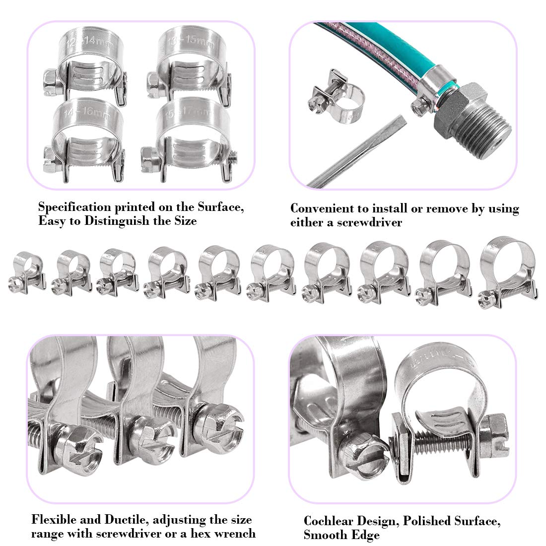 Swpeet 50Pcs 10 Sizes 304 Stainless Steel Mini Fuel Injection Line Style Hose Clamp Assortment Kit Perfect For Automotive, Agric