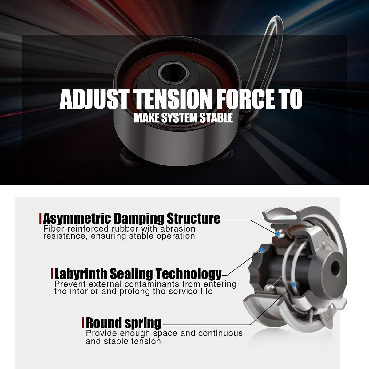 Q: How does the timing belt kit improve engine performance?A: This timing belt kit ensures proper timing of the engine's air distribution structure, allowing the engine cylinders to open and close effectively. This leads to reduced noise, smoother operation, and enhanced power output and acceleration performance.