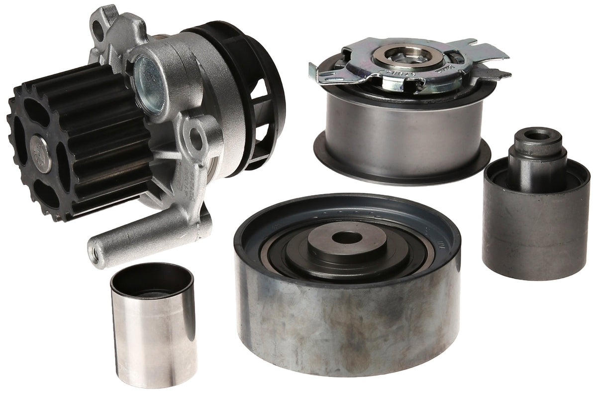 Gates Timing Belt Component Kits with Water Pump o?er customers the best and most complete repair solution by including the same premium components as our TCKs - timing belts, pulleys and tensioners - as well as a water pump. Timing belt driven water pumps should always be replaced at the same time as the timing belt. Don't take chances. With Gates TCKWPs, you can avoid returns by replacing all critical system components at the same time.