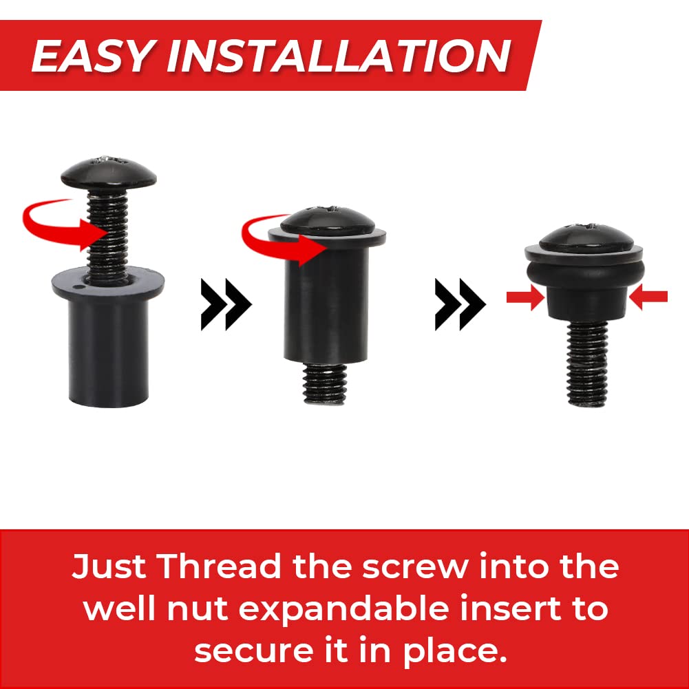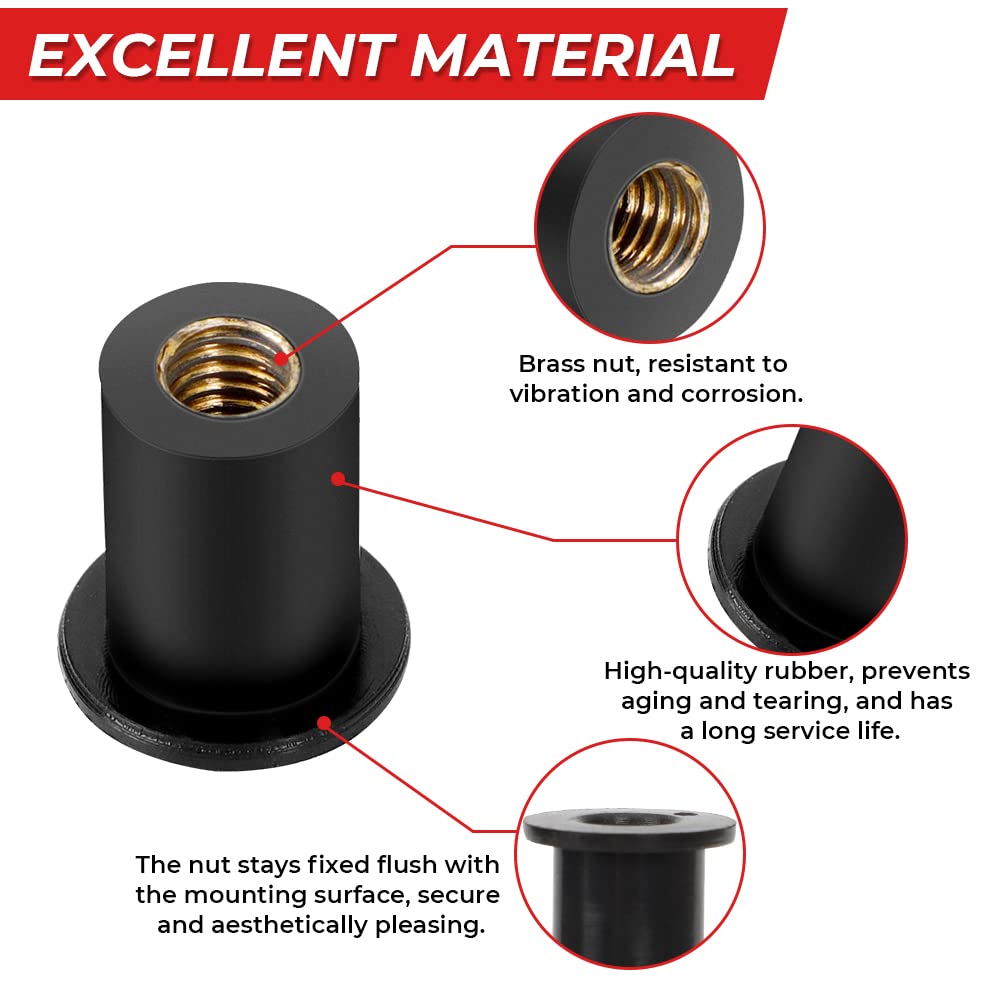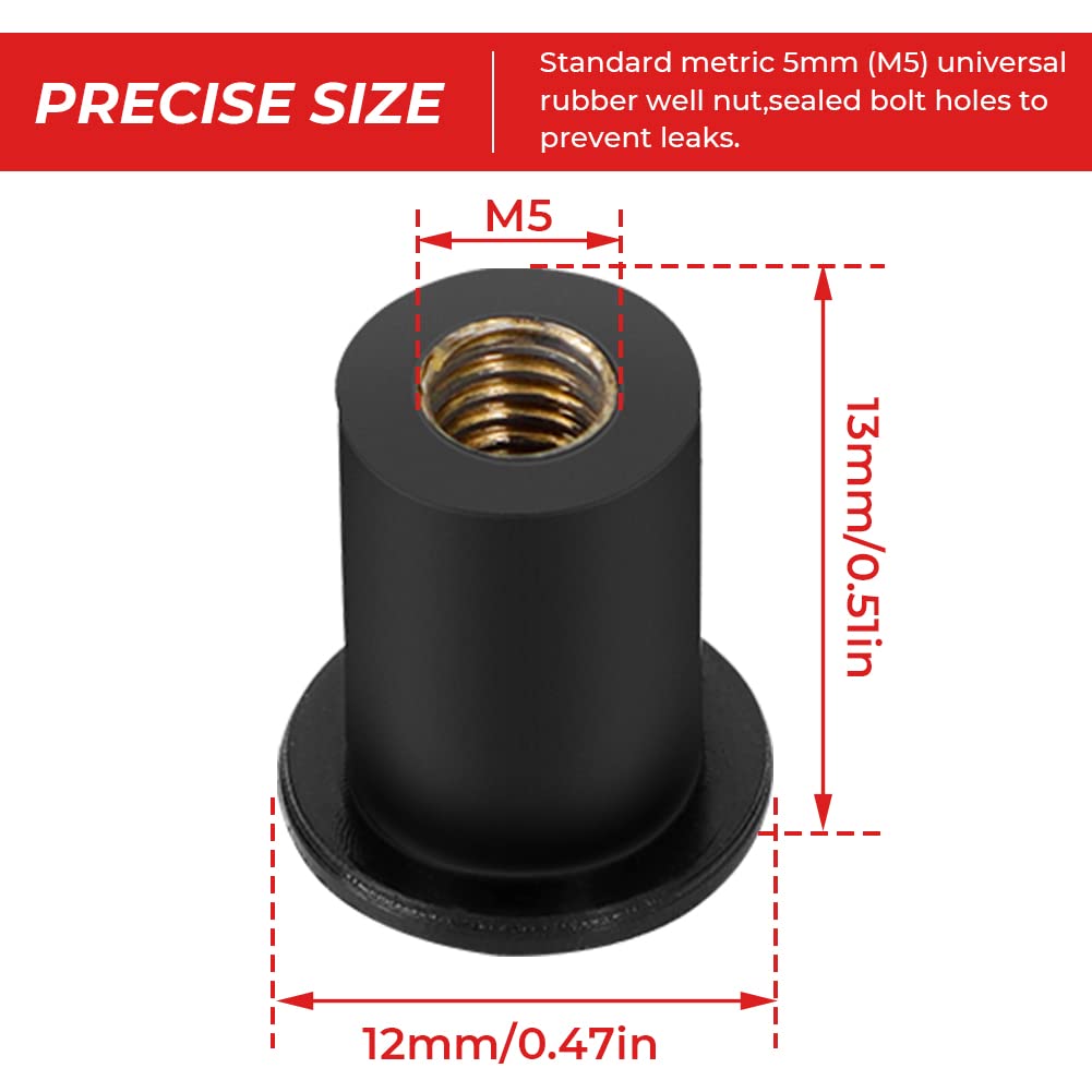 These 5 mm (M 5) universal rubber well nuts fit most windscreens, body, other motorcycle and ATV applications. Also used for attaching bottom fairings together or for mounting top fairings. Features: Thread: M 5 Material: High Quality Rubber with Captive Brass Nut. Perfect for replacing your missing and damaged well nuts. Condition: 100% Brand New. Color: Black Package Includes: 10 PCS Rubber Nuts. Fitment: For many Honda, Kawasaki, Suzuki, Yamaha, Polaris, and other Motorcycle & ATV models. The 5 mm (M5) universal rubber well nut is commonly used to secure motorcycle fairings, parts, body parts, fenders,bumpers and some windscreens. Please feel free to contact us if you have any question. Many thanks ! Metric fairing cowl bolt screw wellnuts is a good choice for your motorcycle.