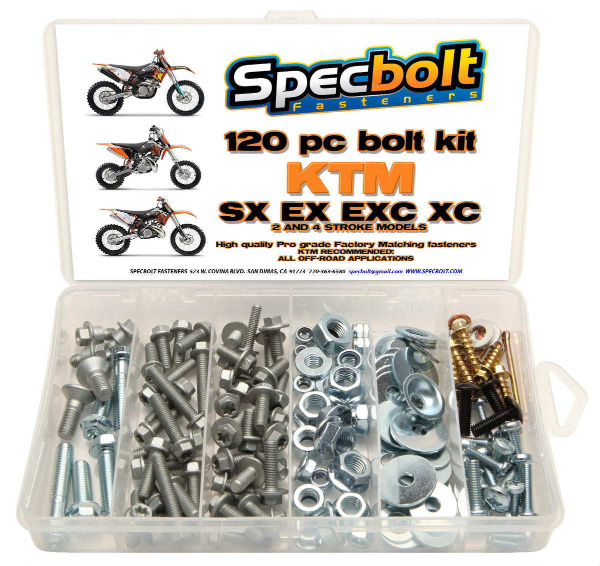 Q: What types of KTM bikes are compatible with the 120pc Specbolt Bolt Kit?A: The 120pc Specbolt Bolt Kit is designed to fit a wide range of KTM SX and EX models, including both 2-stroke bikes (50, 60, 65, 85, 105, 125, 250, 300, 360, 380, 550) and 4-stroke bikes (250, 350, 400, 450, 500, 520, 525, 530, 620, 640).