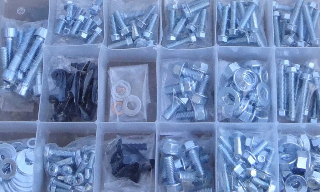 Q: What is included in the 250 piece bolt kit?A: This comprehensive kit includes a variety of factory match flange bolts, flange nuts, lug nuts, lock nuts, cotter pins, sealing washers, fender washers, plastic push rivets, wide head Phillips screws, and more, providing everything you need for basic maintenance and upkeep.
