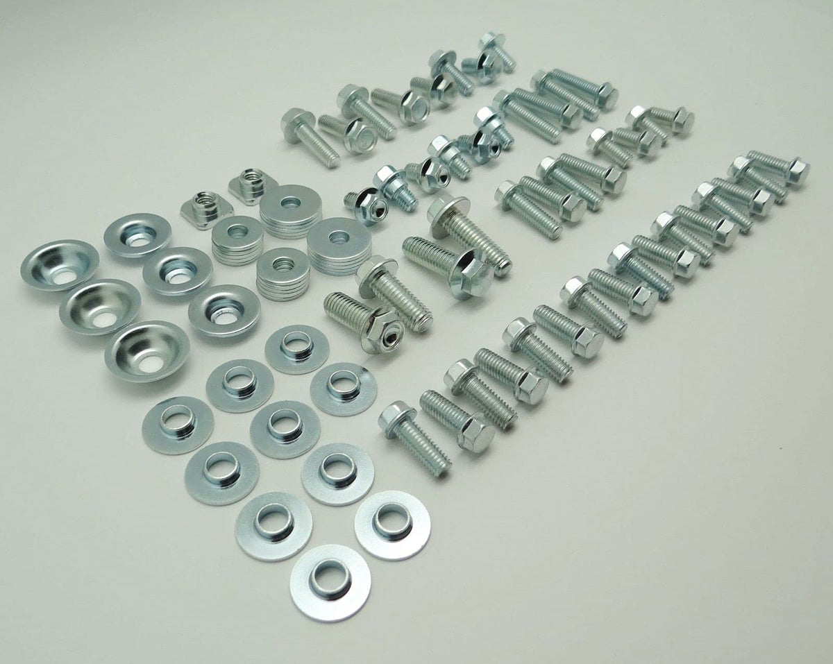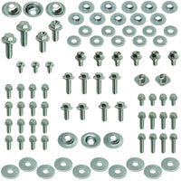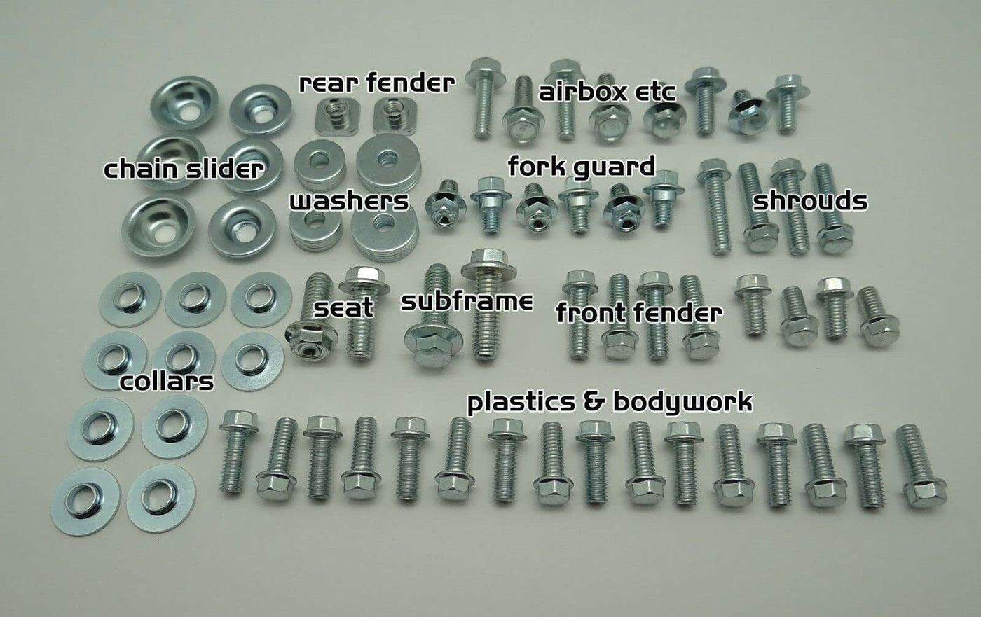 This 87 piece HIGH QUALITY bolt kit was designed to let you replace all the bolts for your plastic/bodywork on your RM and RMZ with 10.9 grade heat treated quality OEM matching fasteners. APPLICATIONS INCLUDE: ALL SUZUKI RM RMZ RMX Each kit contains 87 Suzuki spec bolts in each of the following sizes: * 6 M6 Shouldered Suzuki fork guard bolts (modern RMZ and RM) * 2 Square M6 nuts (for modern RMZ RM rear fender) * 6 Dished washers (chain slider) * 3 M5x10 pan head screws (chain slider) * 4 M6x12 flange bolts with 8mm head (radiator shrouds) * 2 M6x12 wide flange bolts (body) * 2 M6x16 wide flange bolts (body) * 2 M8x20 dish head flange seat bolts (seat) *16 M6x16 flange bolts with 8mm head (plastics fenders & number plate) * 4 M6x20 flange bolts with 8mm head (shrouds long air-box) * 4 M6x20 flange bolts with 10mm head (long plastics) * 4 M6x25 flange bolts with 8mm head (fuel tank & air box) * 2 M8x25 wide flange subframe bolts *10 M6x16 fender washers *10 M6x20 fender washers *10 M6x18 collar washers (mounting fenders & plastics) These high quality heat treated grade 10.9 zinc plated flange bolts meet and exceed what originally came on your Suzuki motorcycle. They are all plated with brilliant zinc plating that will look great and not corrode. They are even salt water resistant. ENOUGH TO MOUNT YOUR FRONT FENDER, REAR FENDER, FORK GUARDS, SEAT, RADIATOR SHROUDS, FRONT NUMBER PLATE, SIDE PANELS, CHAIN SLIDER, LOWER SUB-FRAME, AND YOU WILL EVEN HAVE A FEW SPARES FOR FUTURE REPLACEMENTS.