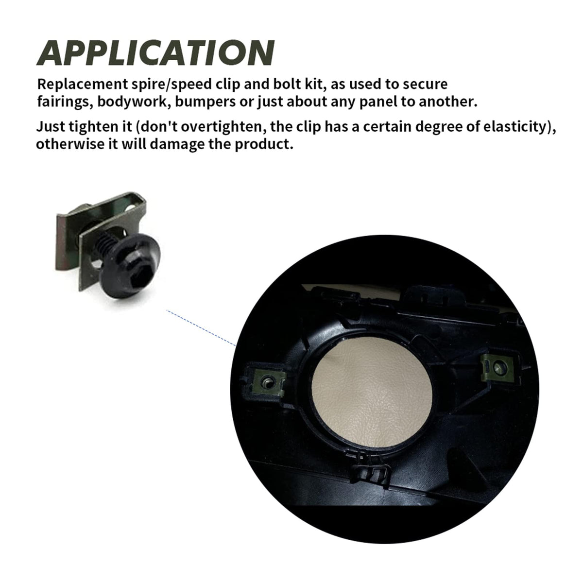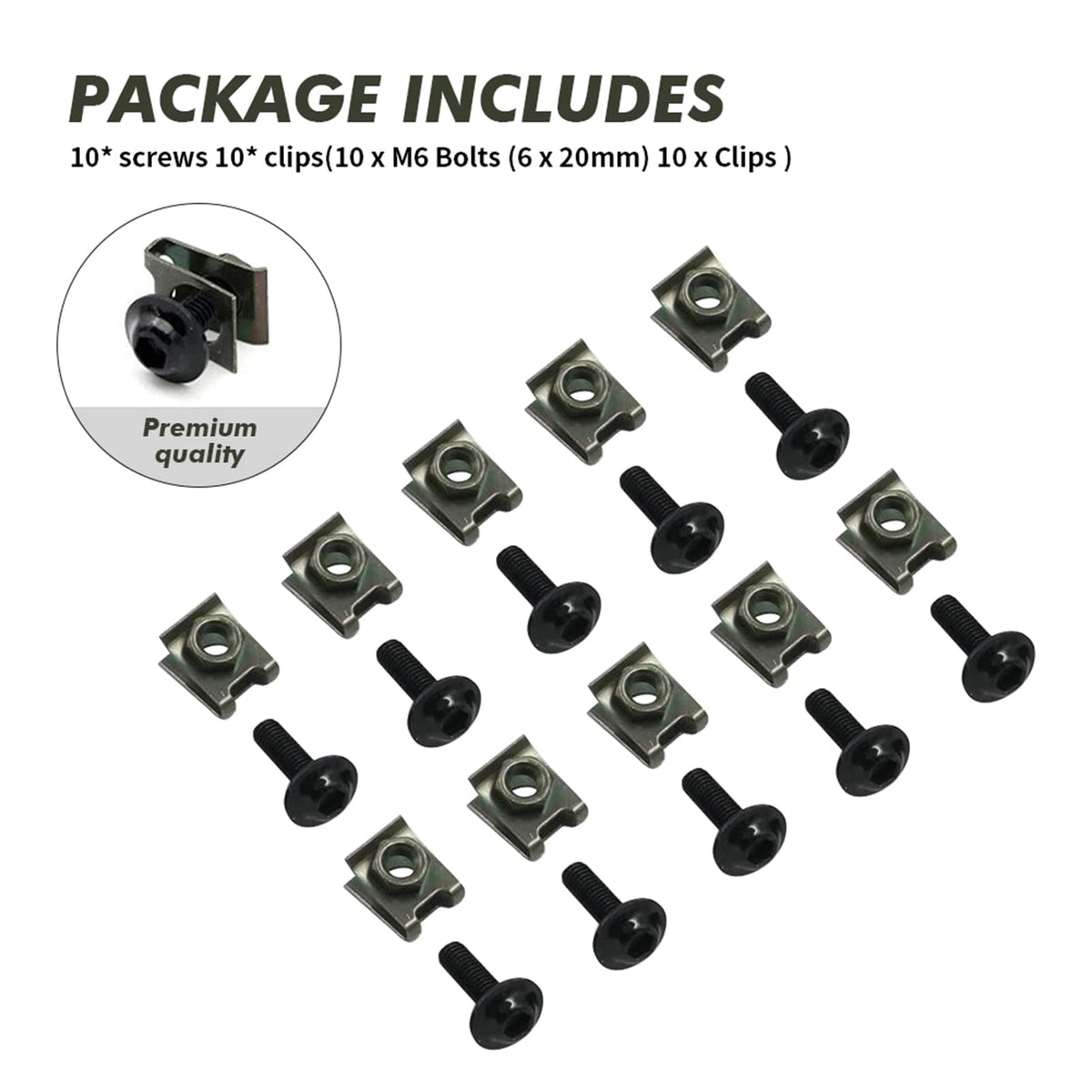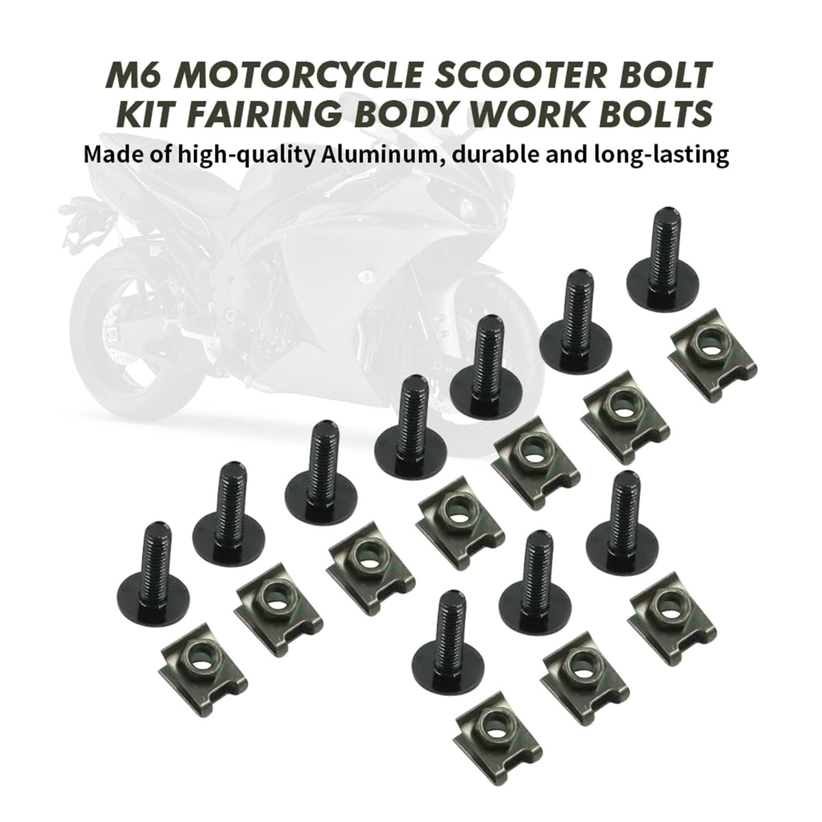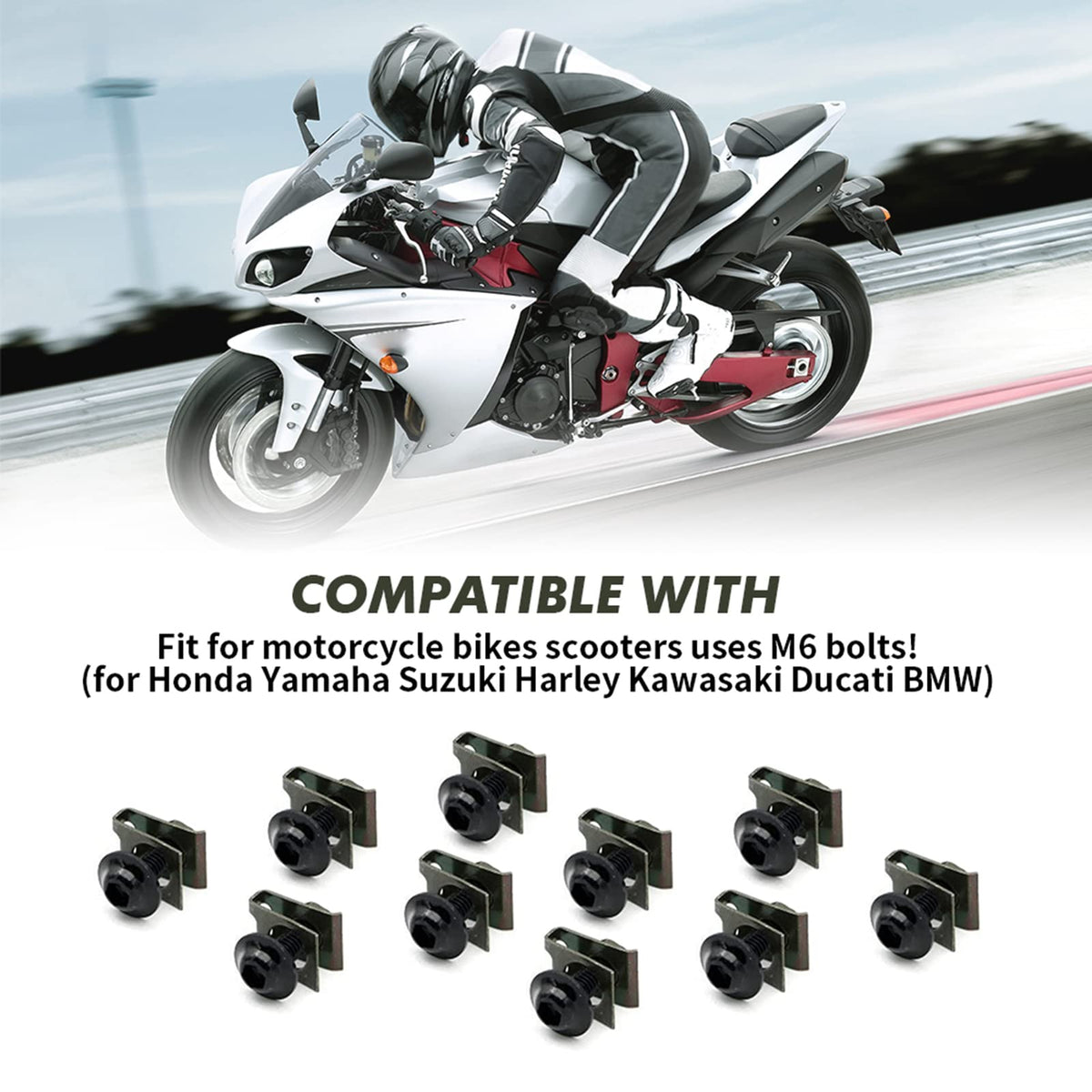 Fitment: 6 mm M6 Fairing Body Work Bolts Spire Speedcompatible with:For Honda Yamaha Suzuki Kawasaki Ducati BMW. Features: 1.made of premium Aluminum. 2.Wide range of useItem Details: Surface Finish: Rack PlatingPackage:10 x M6 Bolts (6 x 20mm) 10 x Clips Note: Please feel free to contact us if you have any other questions.